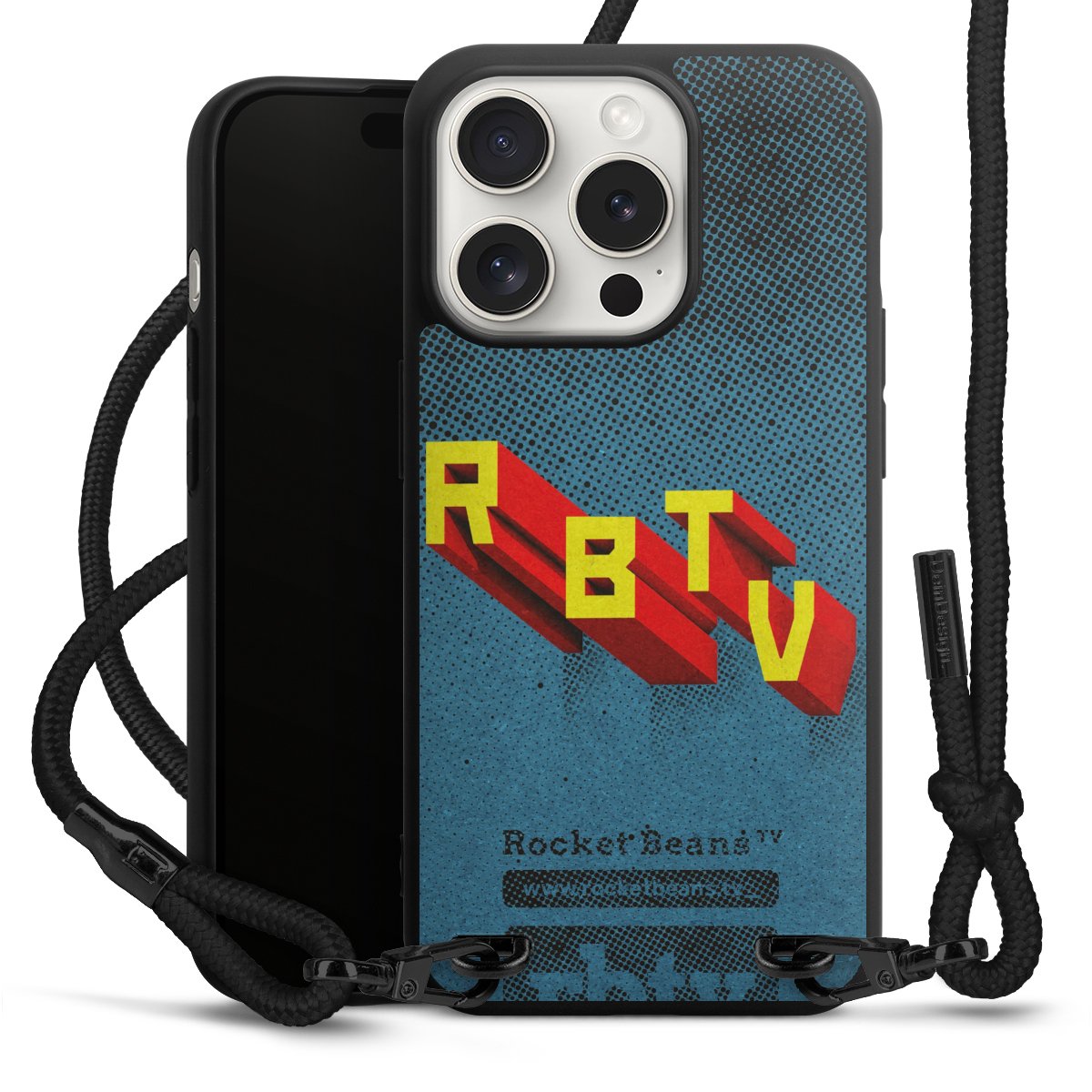 Pure Black: Handyhülle, Stoffband und Metalldetails in stylischem Mattschwarz.
