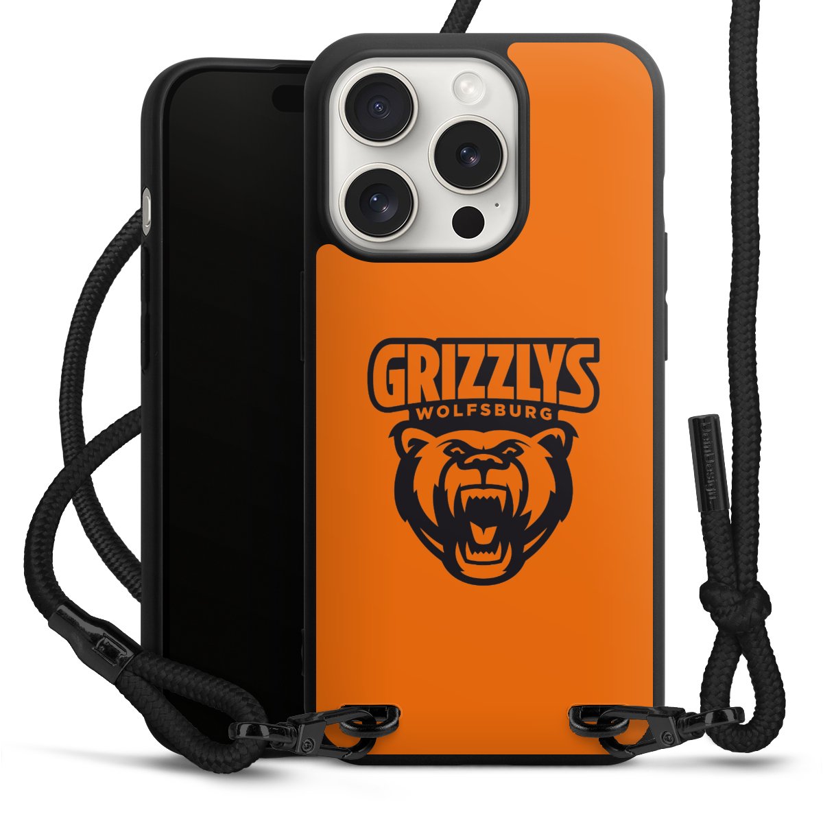 Pure Black: Handyhülle, Stoffband und Metalldetails in stylischem Mattschwarz.