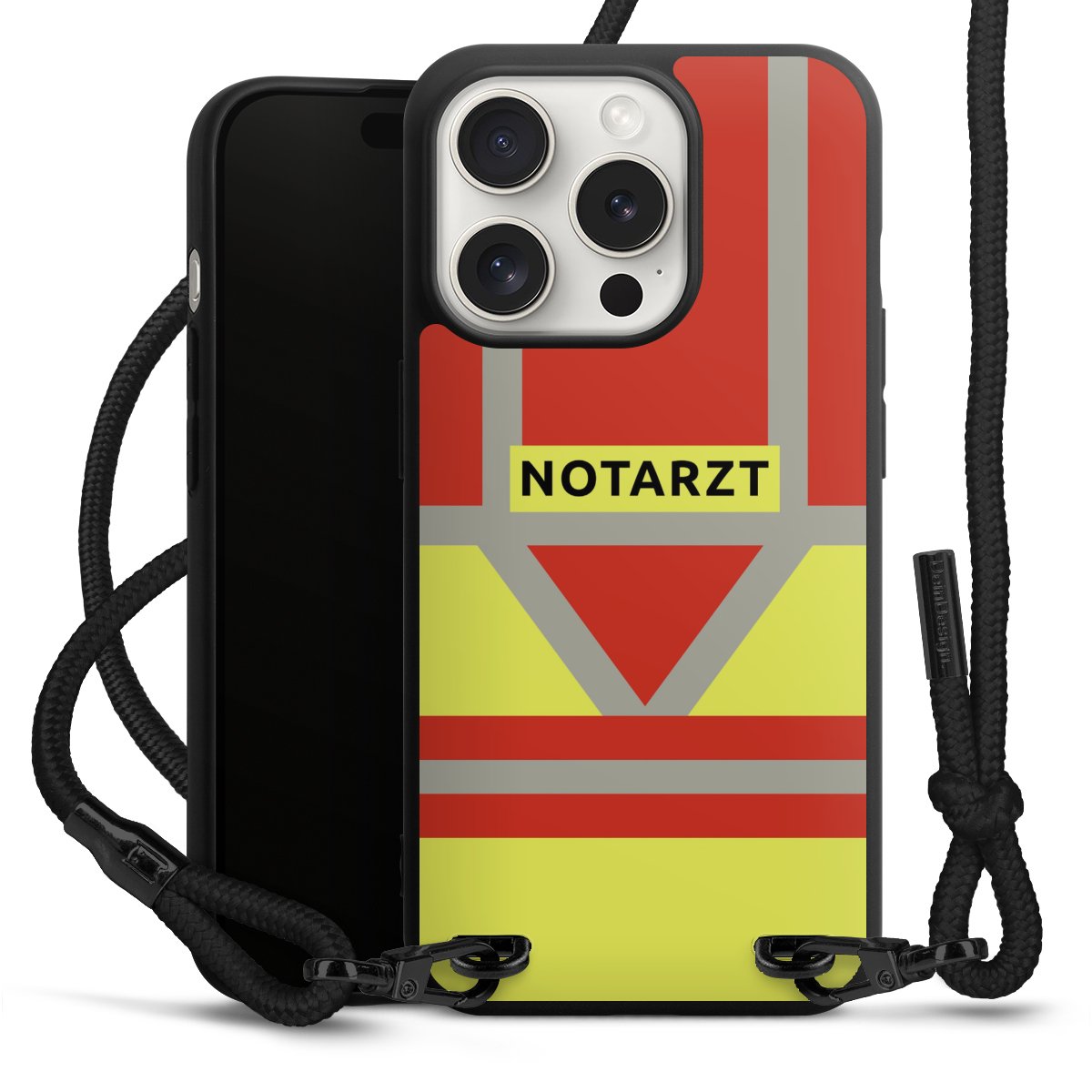 Pure Black: Handyhülle, Stoffband und Metalldetails in stylischem Mattschwarz.