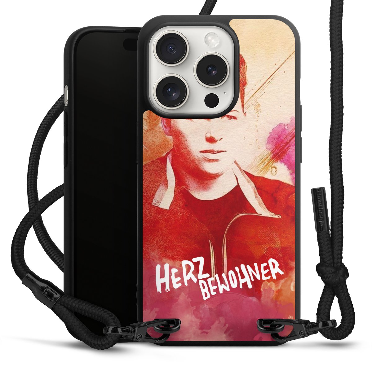 Pure Black: Handyhülle, Stoffband und Metalldetails in stylischem Mattschwarz.