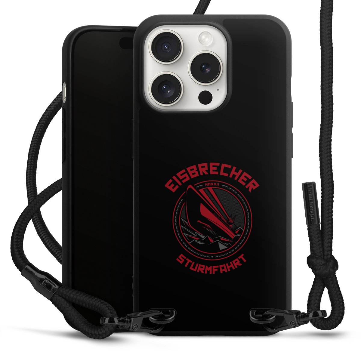 Pure Black: Handyhülle, Stoffband und Metalldetails in stylischem Mattschwarz.