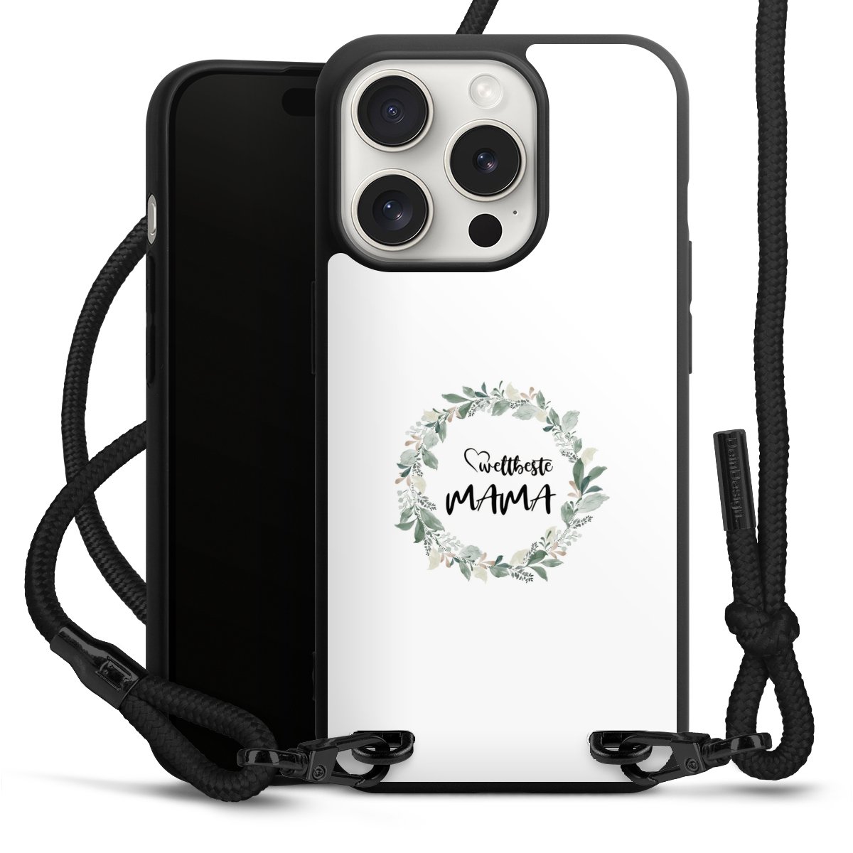 Pure Black: Handyhülle, Stoffband und Metalldetails in stylischem Mattschwarz.