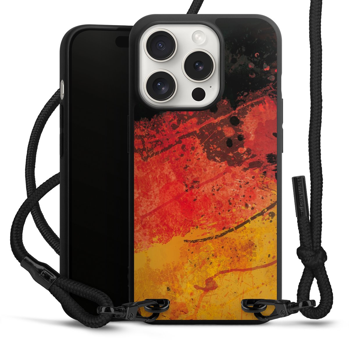 Pure Black: Handyhülle, Stoffband und Metalldetails in stylischem Mattschwarz.