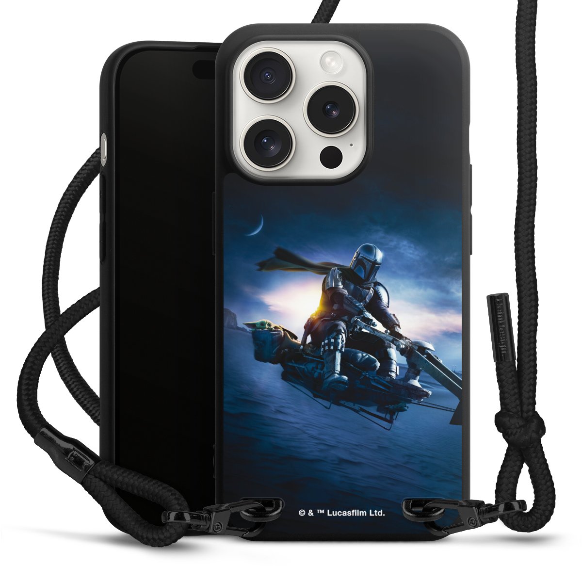 Pure Black: Handyhülle, Stoffband und Metalldetails in stylischem Mattschwarz.