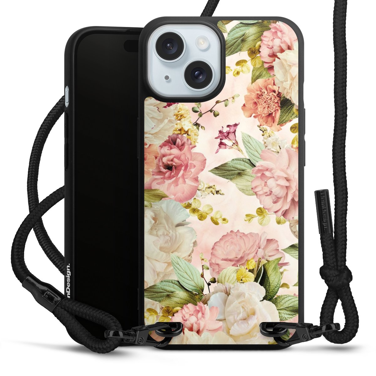Pure Black: Handyhülle, Stoffband und Metalldetails in stylischem Mattschwarz.