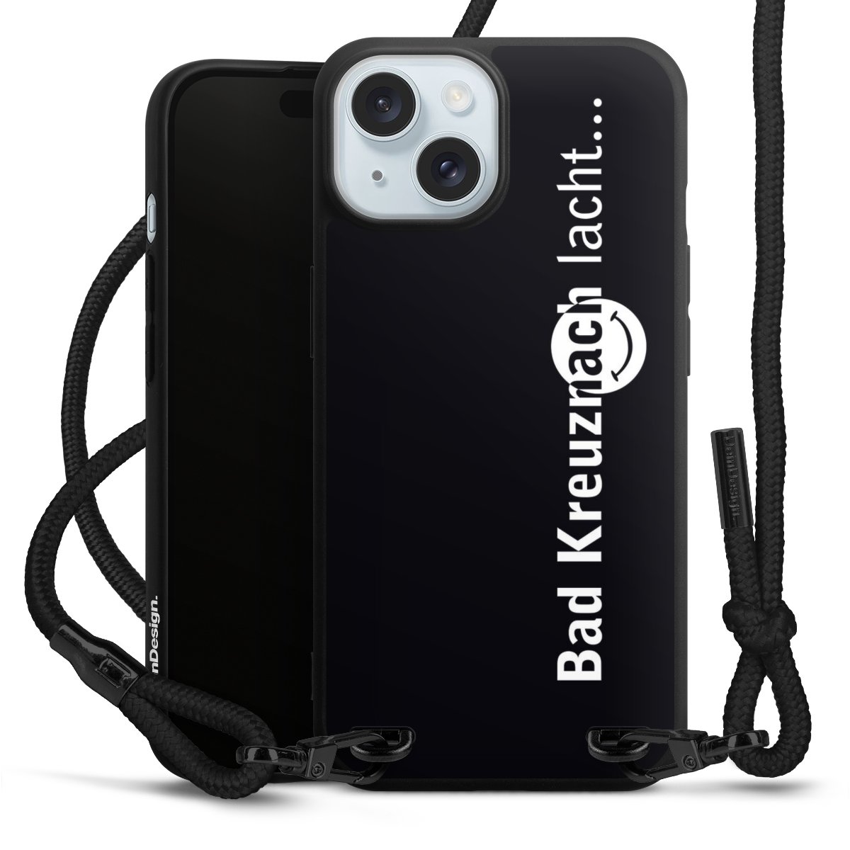 Pure Black: Handyhülle, Stoffband und Metalldetails in stylischem Mattschwarz.