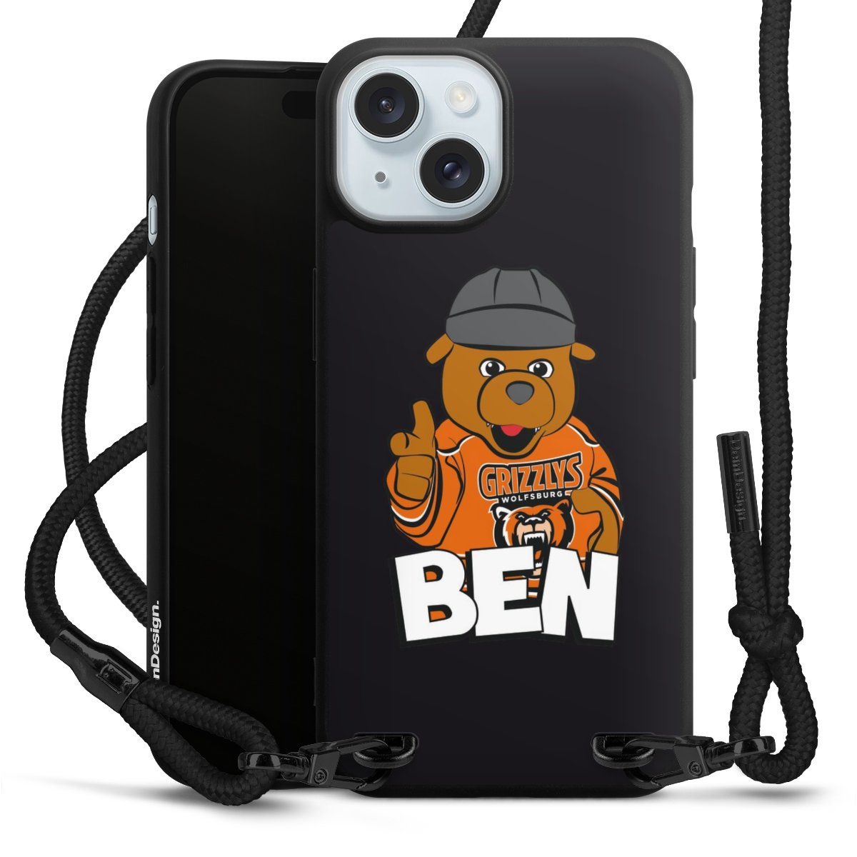 Pure Black: Handyhülle, Stoffband und Metalldetails in stylischem Mattschwarz.