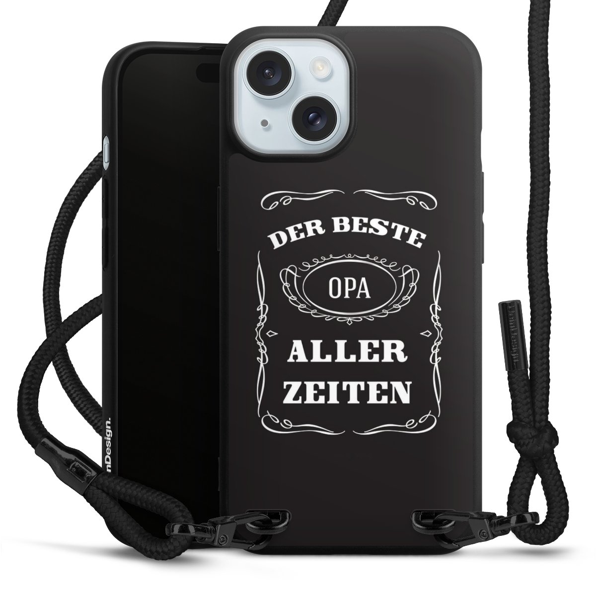 Pure Black: Handyhülle, Stoffband und Metalldetails in stylischem Mattschwarz.