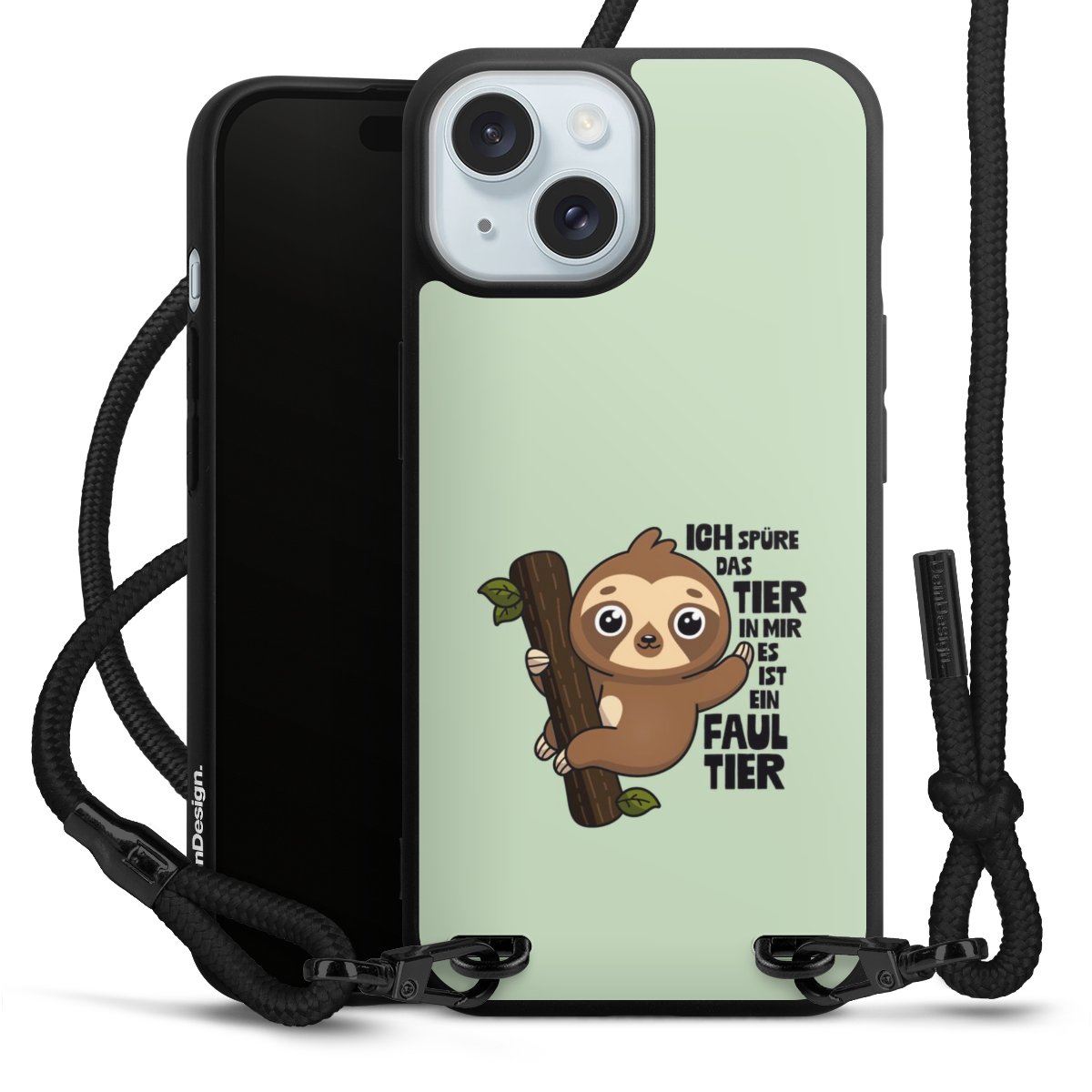 Pure Black: Handyhülle, Stoffband und Metalldetails in stylischem Mattschwarz.