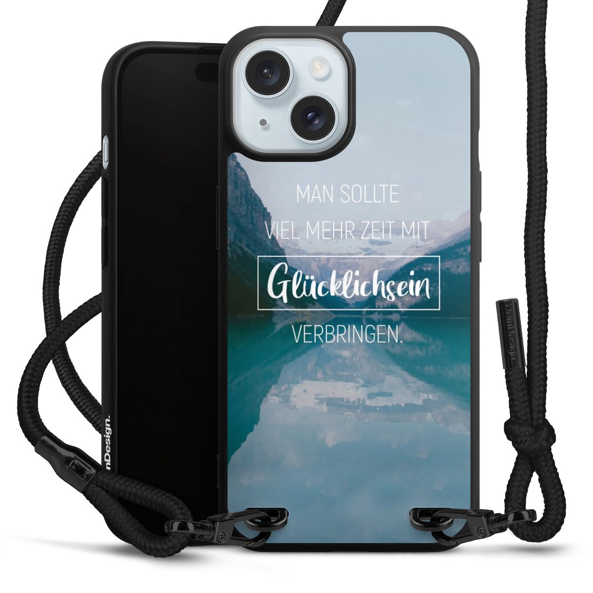 Pure Black: Handyhülle, Stoffband und Metalldetails in stylischem Mattschwarz.