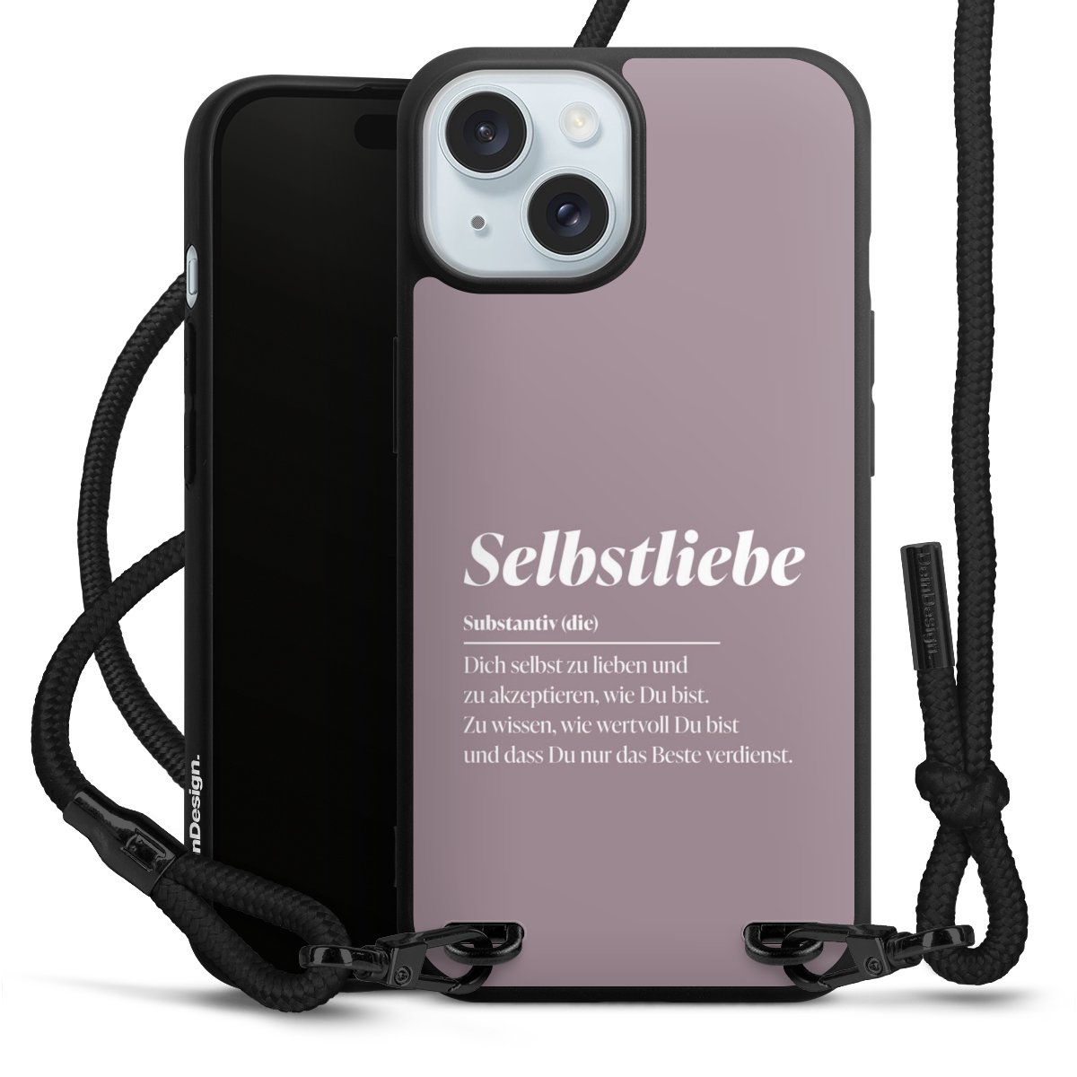 Pure Black: Handyhülle, Stoffband und Metalldetails in stylischem Mattschwarz.