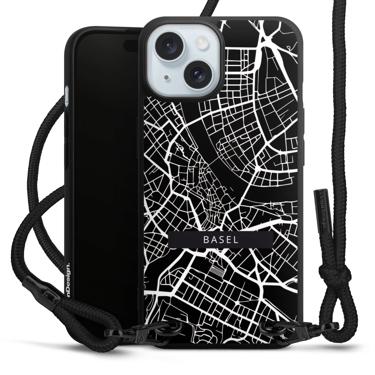 Pure Black: Handyhülle, Stoffband und Metalldetails in stylischem Mattschwarz.