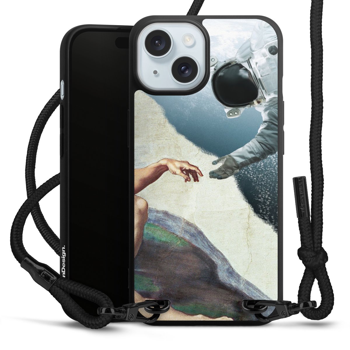 Pure Black: Handyhülle, Stoffband und Metalldetails in stylischem Mattschwarz.