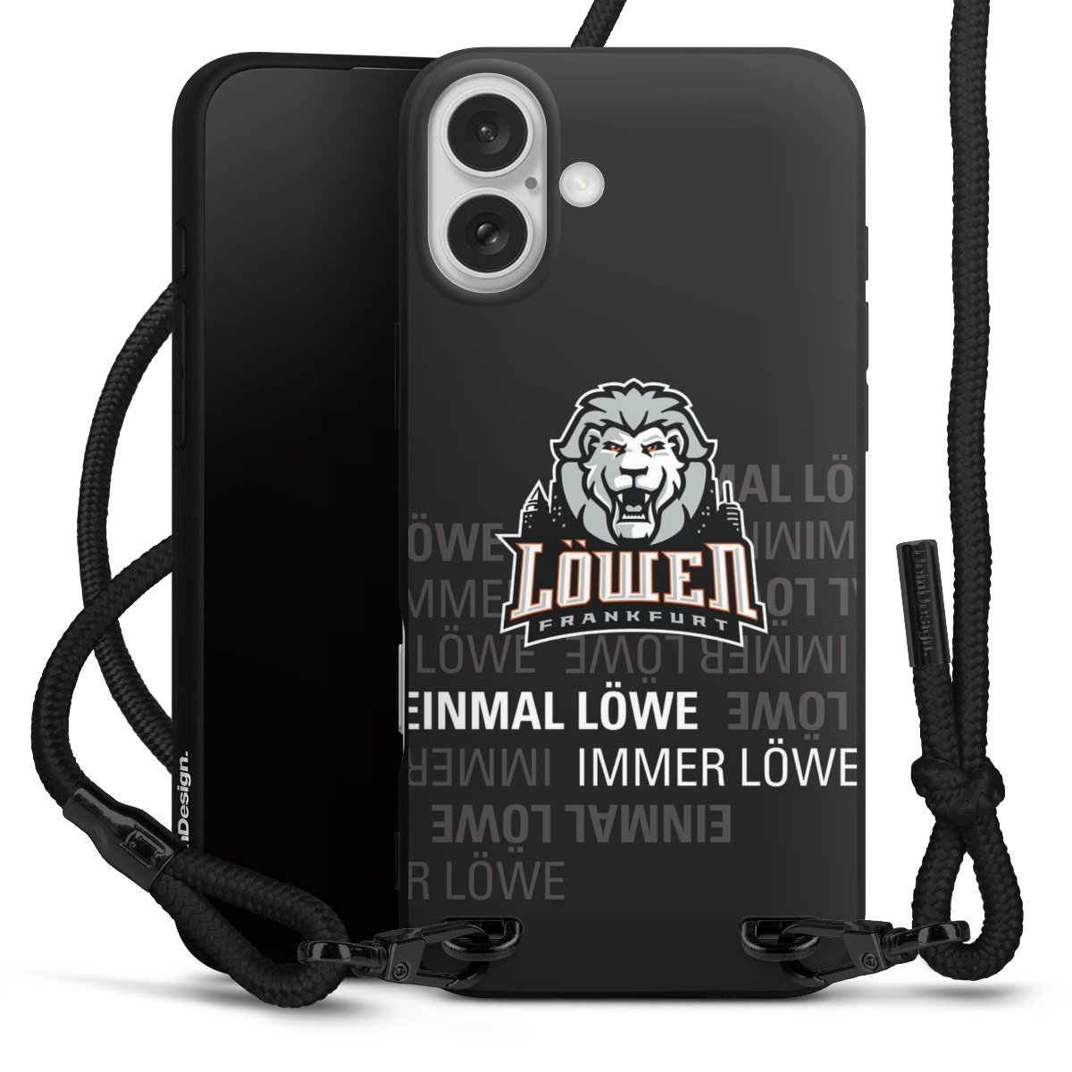 Pure Black: Handyhülle, Stoffband und Metalldetails in stylischem Mattschwarz.