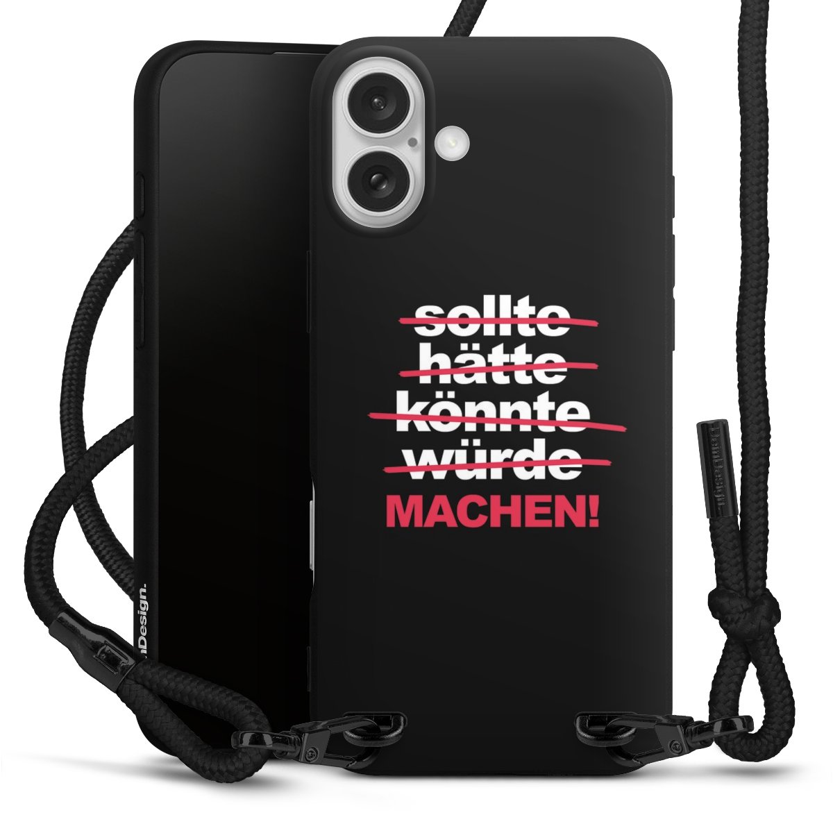 Pure Black: Handyhülle, Stoffband und Metalldetails in stylischem Mattschwarz.
