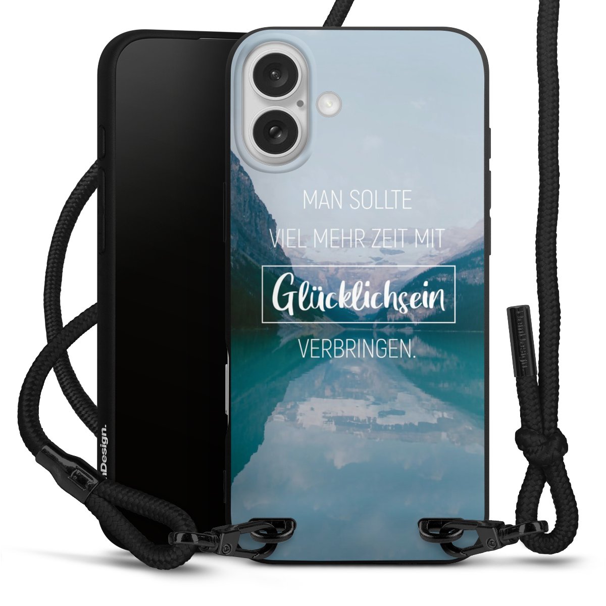 Pure Black: Handyhülle, Stoffband und Metalldetails in stylischem Mattschwarz.