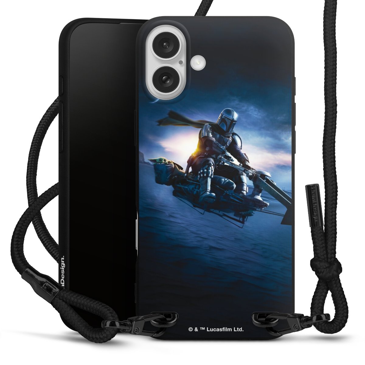 Pure Black: Handyhülle, Stoffband und Metalldetails in stylischem Mattschwarz.