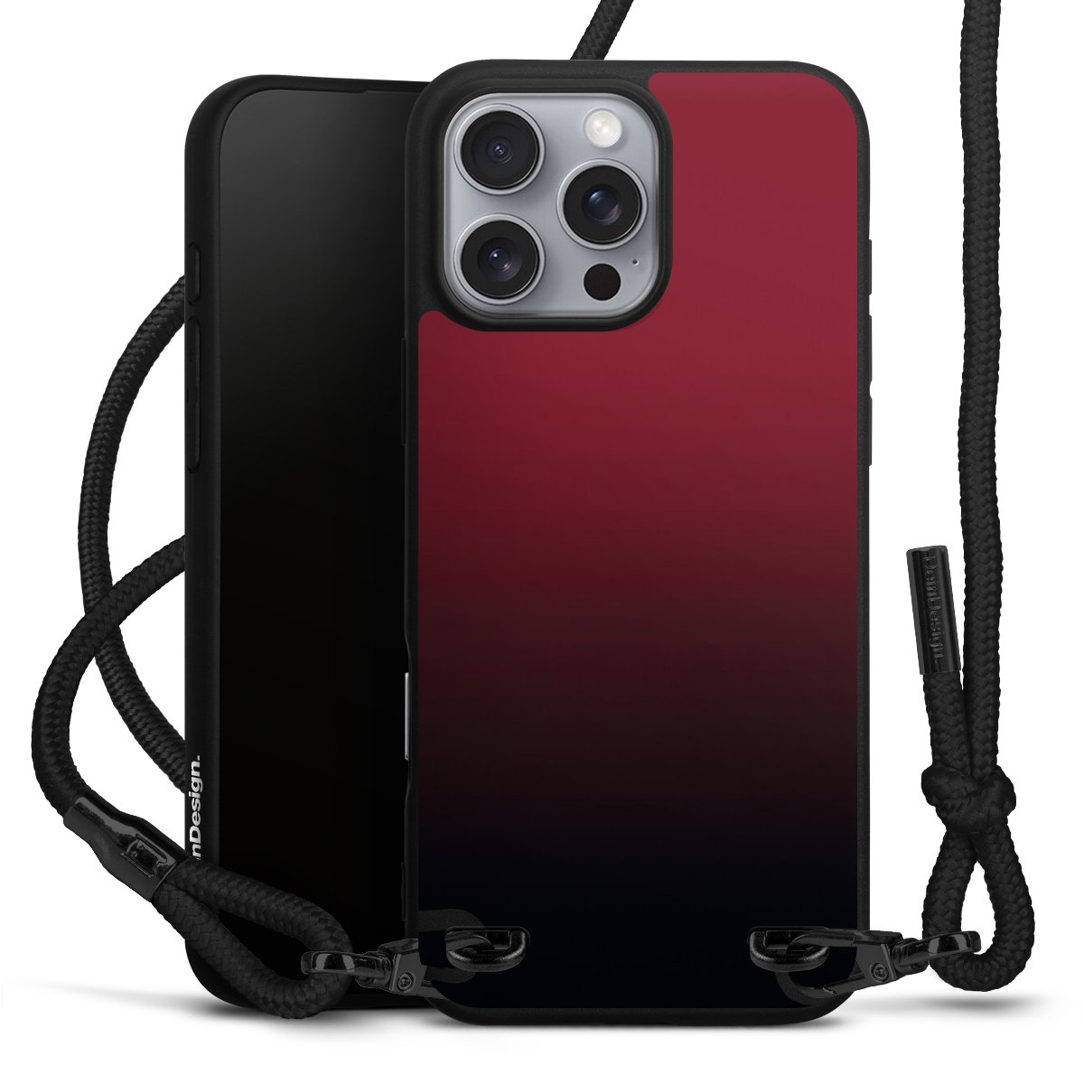 Pure Black: Handyhülle, Stoffband und Metalldetails in stylischem Mattschwarz.