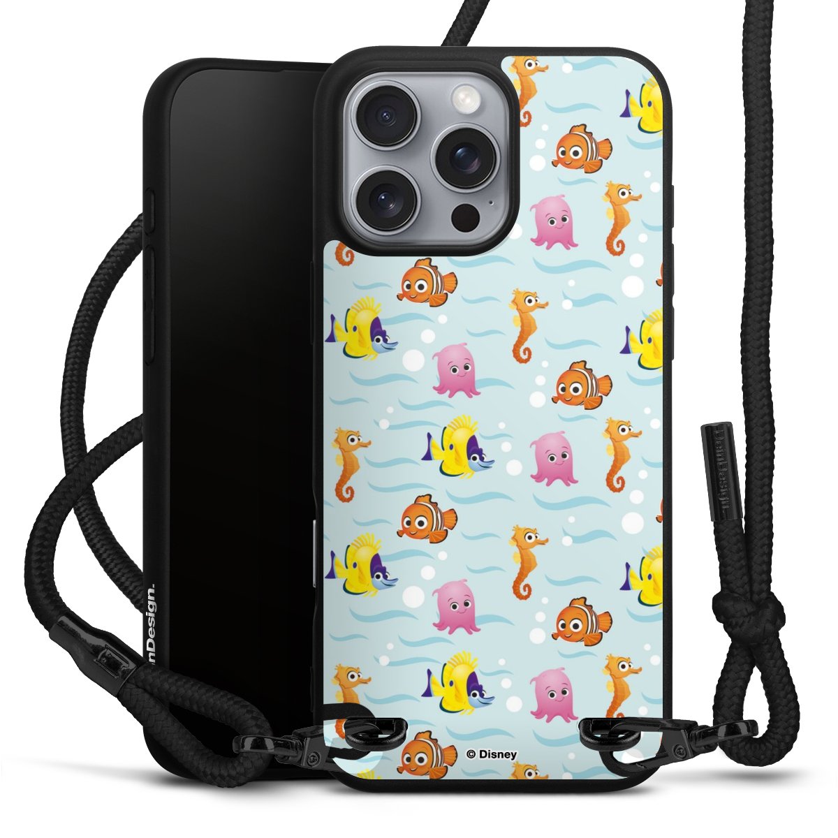 Pure Black: Handyhülle, Stoffband und Metalldetails in stylischem Mattschwarz.