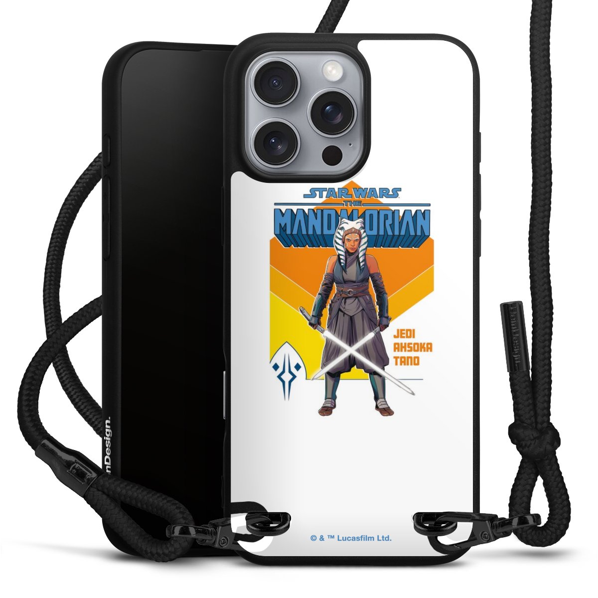 Pure Black: Handyhülle, Stoffband und Metalldetails in stylischem Mattschwarz.