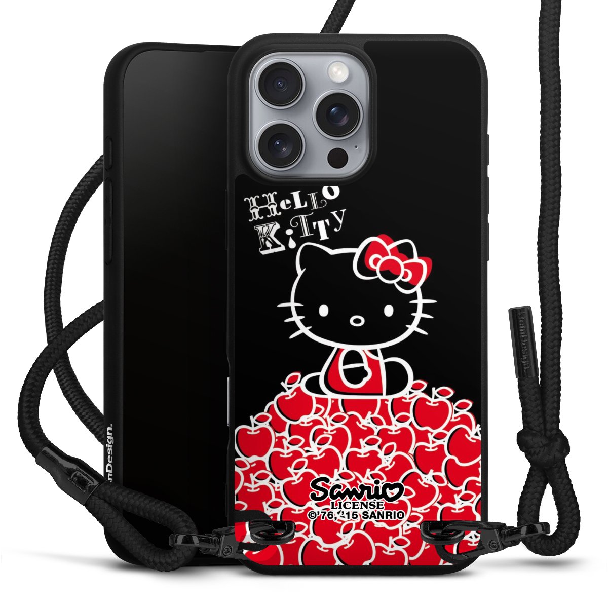 Pure Black: Handyhülle, Stoffband und Metalldetails in stylischem Mattschwarz.