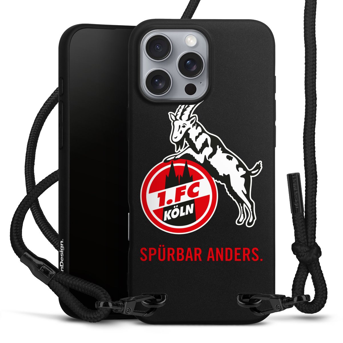 Pure Black: Handyhülle, Stoffband und Metalldetails in stylischem Mattschwarz.