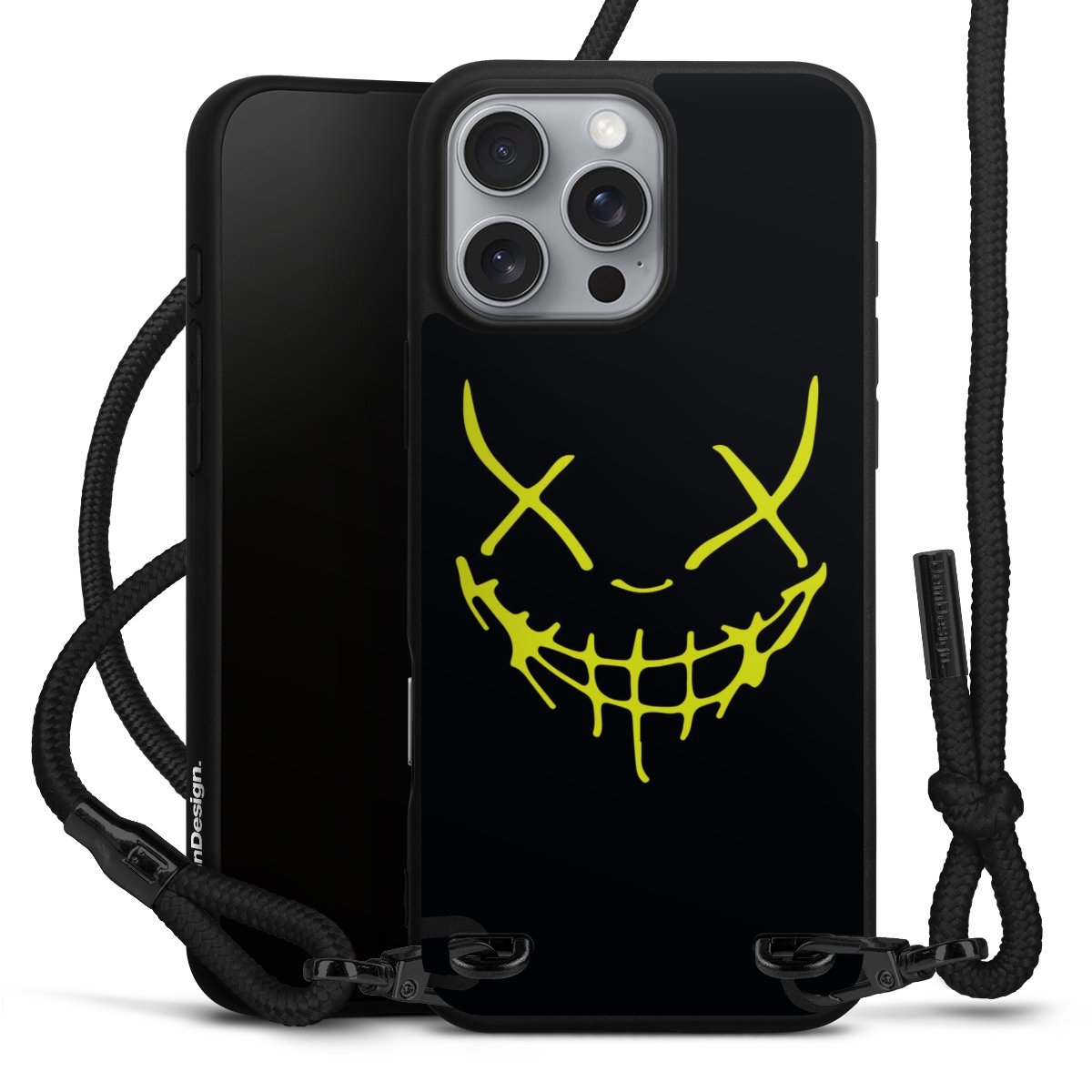 Pure Black: Handyhülle, Stoffband und Metalldetails in stylischem Mattschwarz.