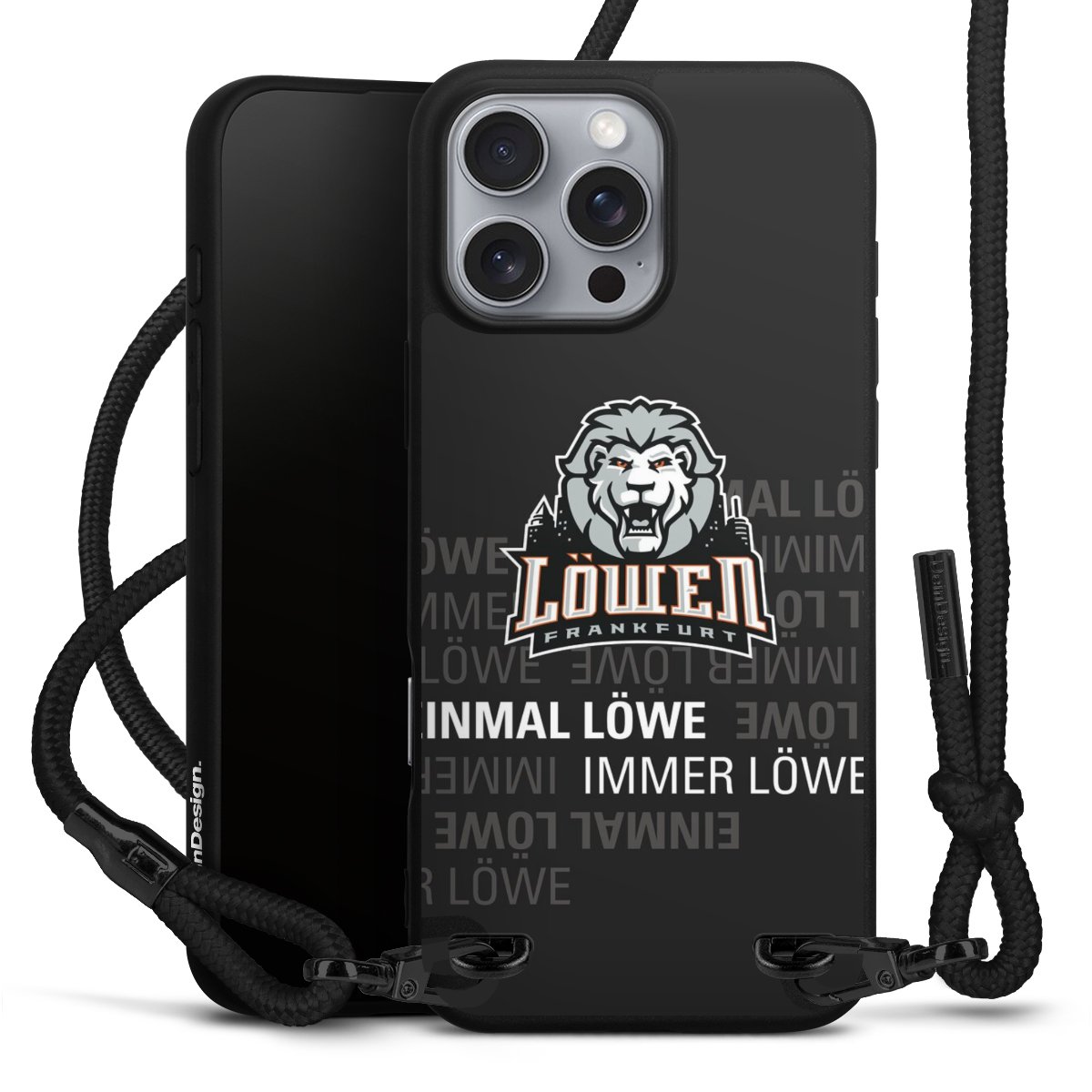 Pure Black: Handyhülle, Stoffband und Metalldetails in stylischem Mattschwarz.
