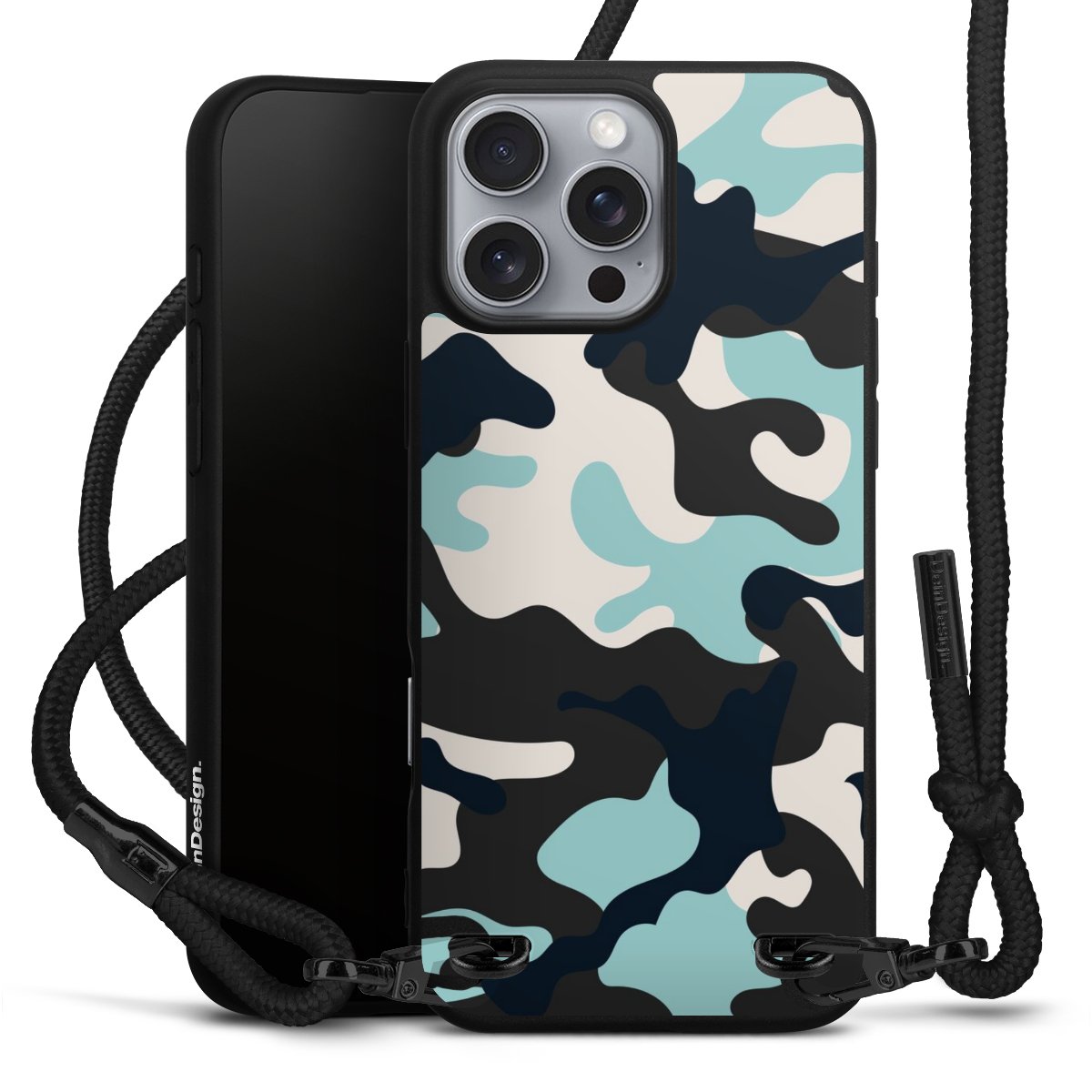 Pure Black: Handyhülle, Stoffband und Metalldetails in stylischem Mattschwarz.