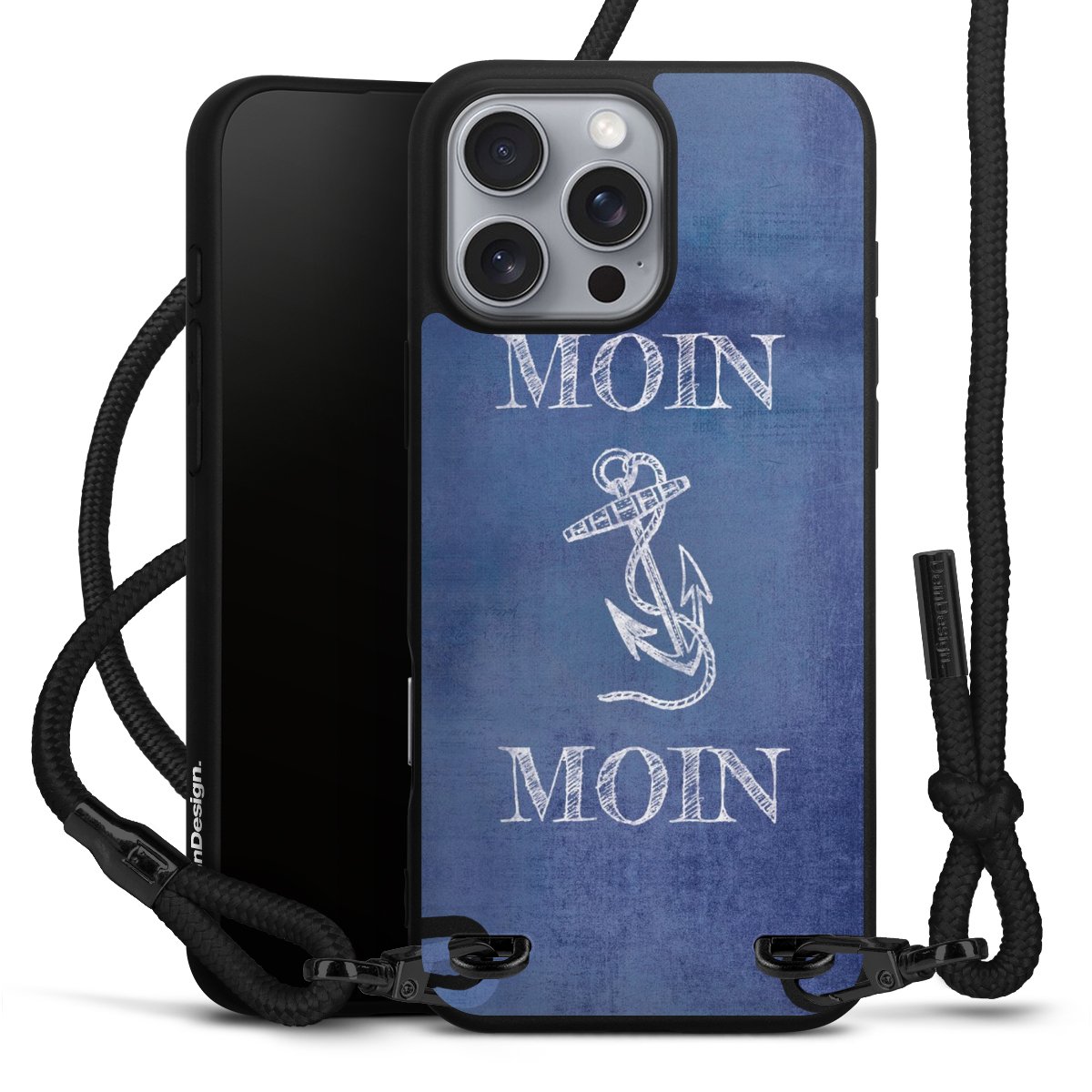 Pure Black: Handyhülle, Stoffband und Metalldetails in stylischem Mattschwarz.