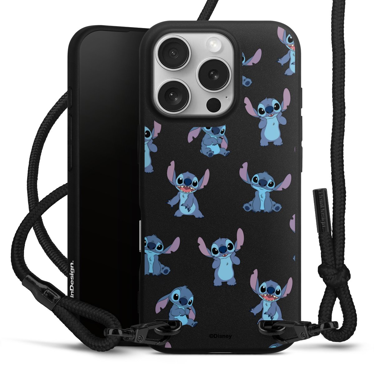 Pure Black: Handyhülle, Stoffband und Metalldetails in stylischem Mattschwarz.