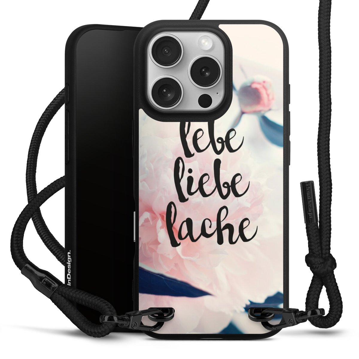 Pure Black: Handyhülle, Stoffband und Metalldetails in stylischem Mattschwarz.