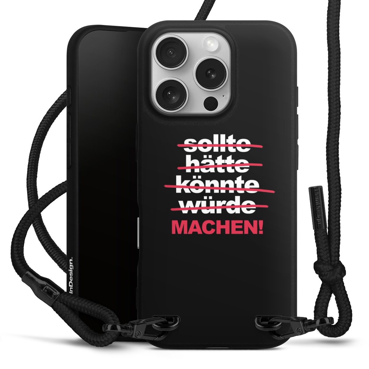 Pure Black: Handyhülle, Stoffband und Metalldetails in stylischem Mattschwarz.
