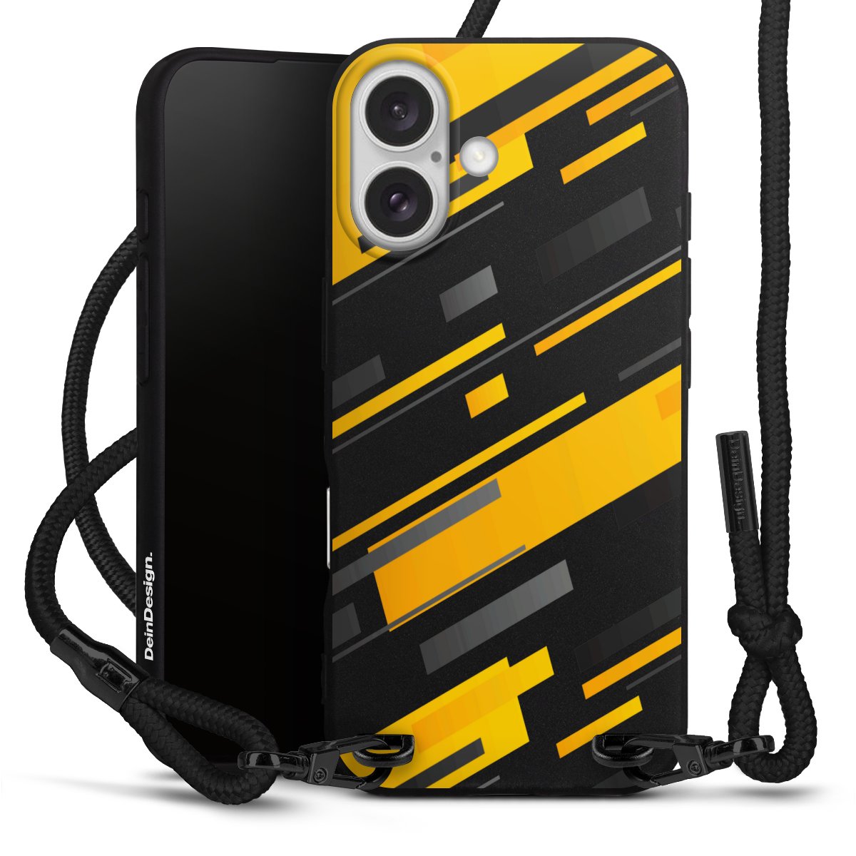 Pure Black: Handyhülle, Stoffband und Metalldetails in stylischem Mattschwarz.