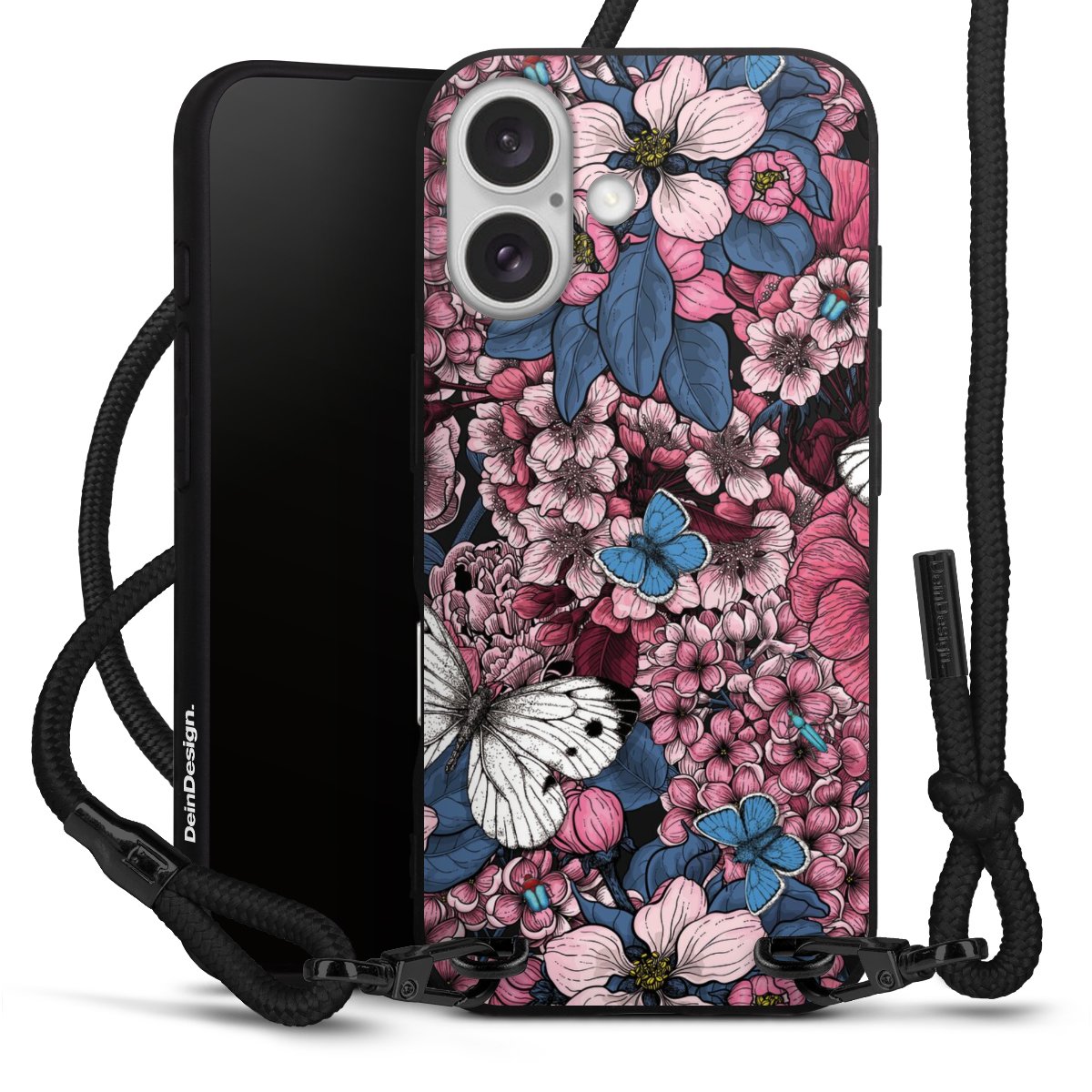 Pure Black: Handyhülle, Stoffband und Metalldetails in stylischem Mattschwarz.