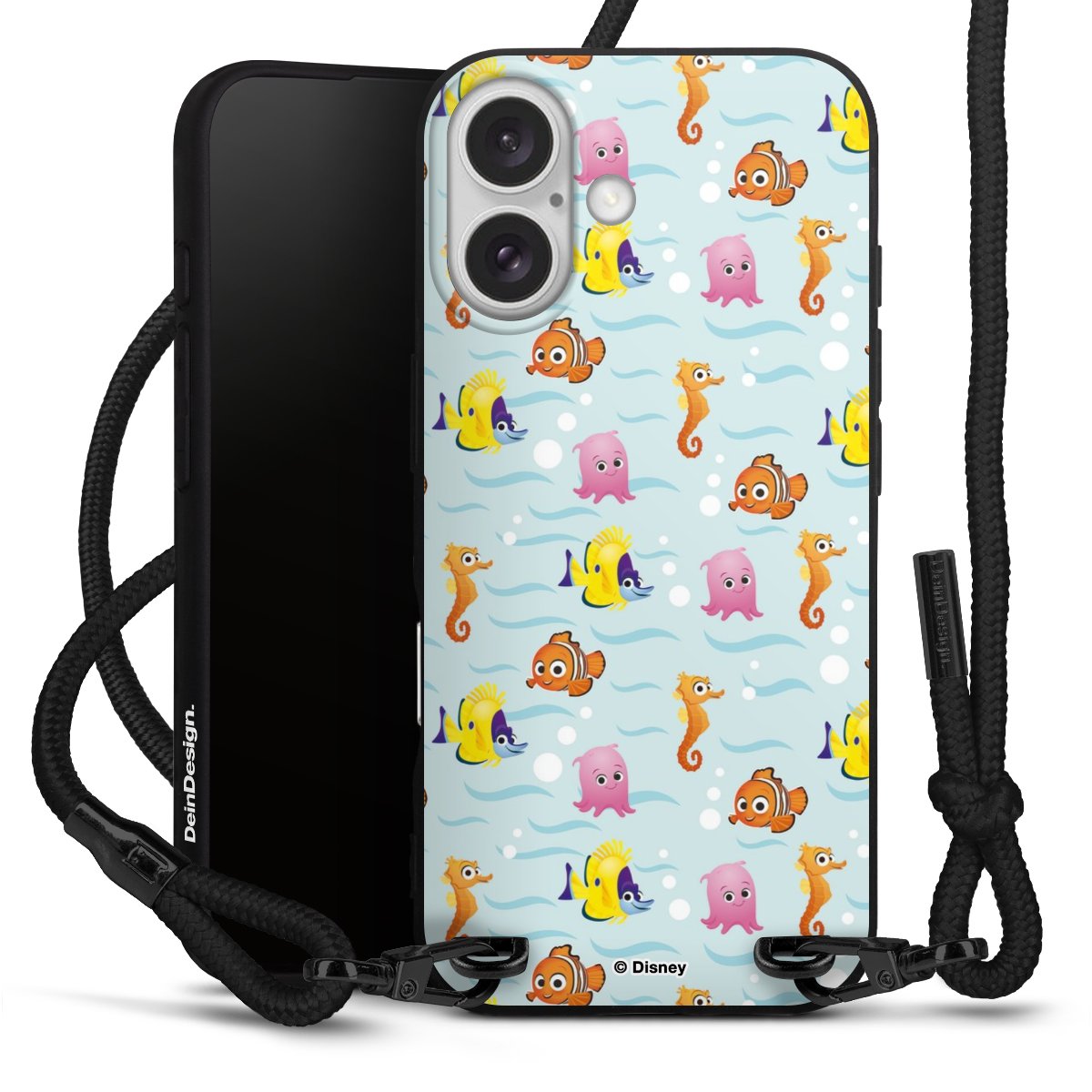 Pure Black: Handyhülle, Stoffband und Metalldetails in stylischem Mattschwarz.