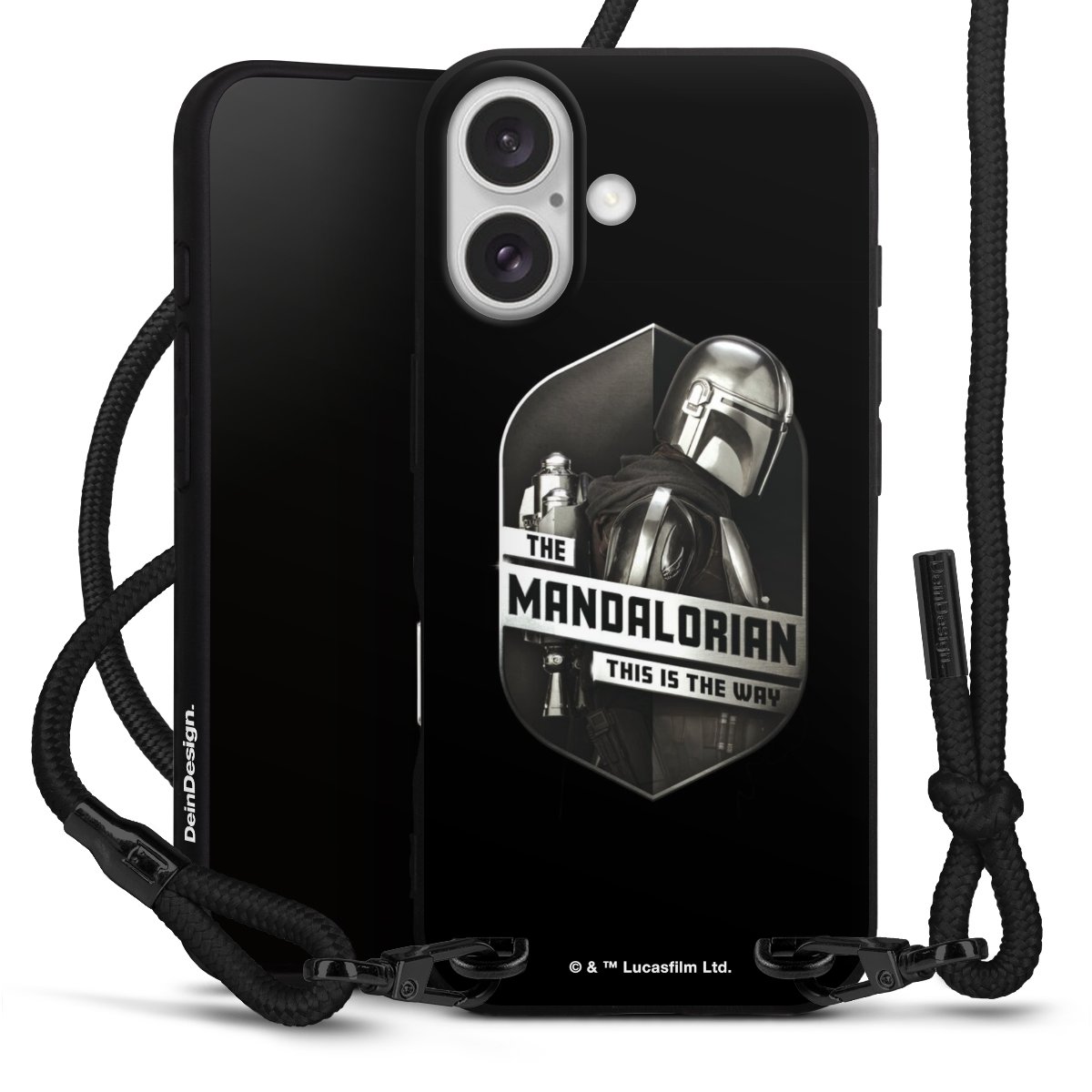 Pure Black: Handyhülle, Stoffband und Metalldetails in stylischem Mattschwarz.