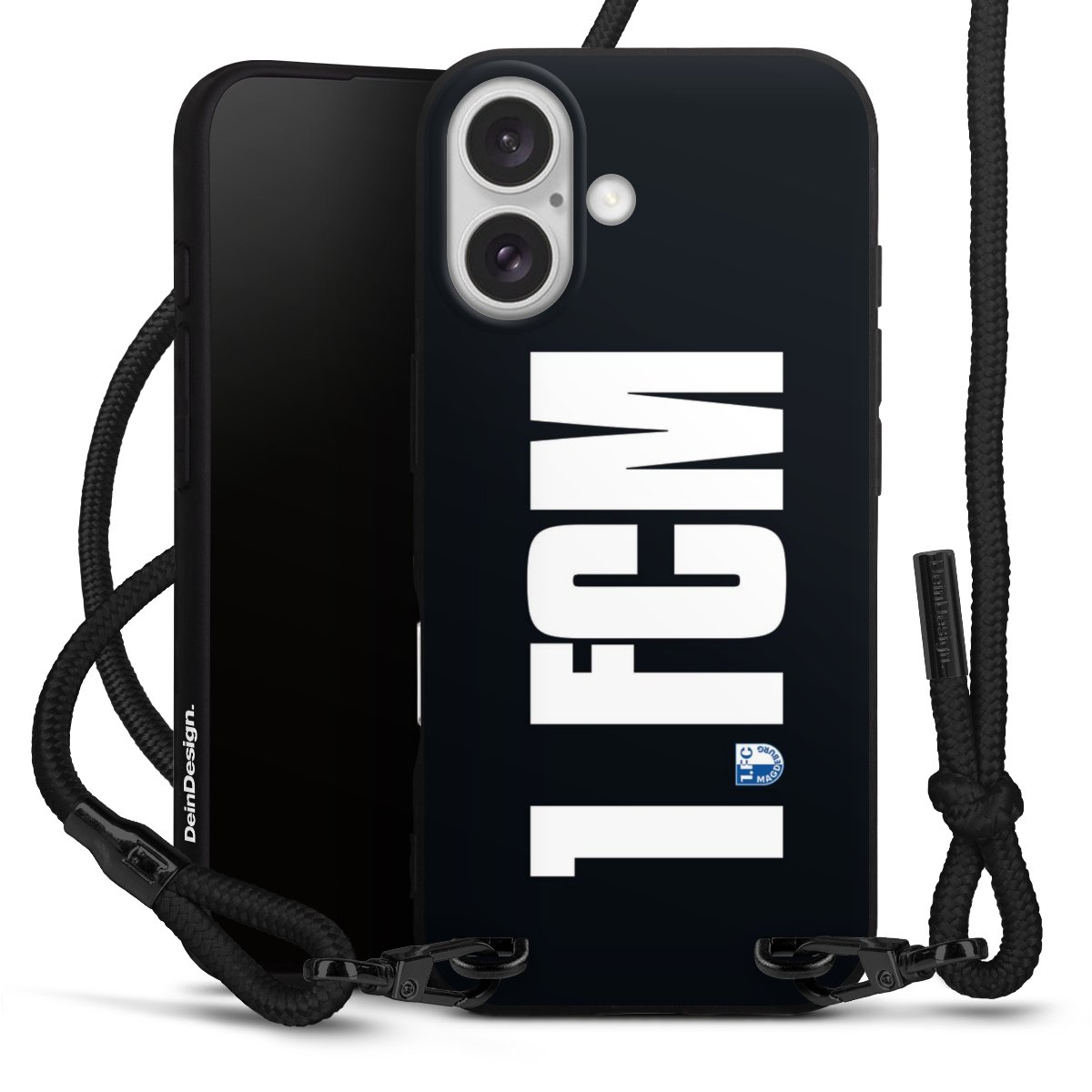 Pure Black: Handyhülle, Stoffband und Metalldetails in stylischem Mattschwarz.