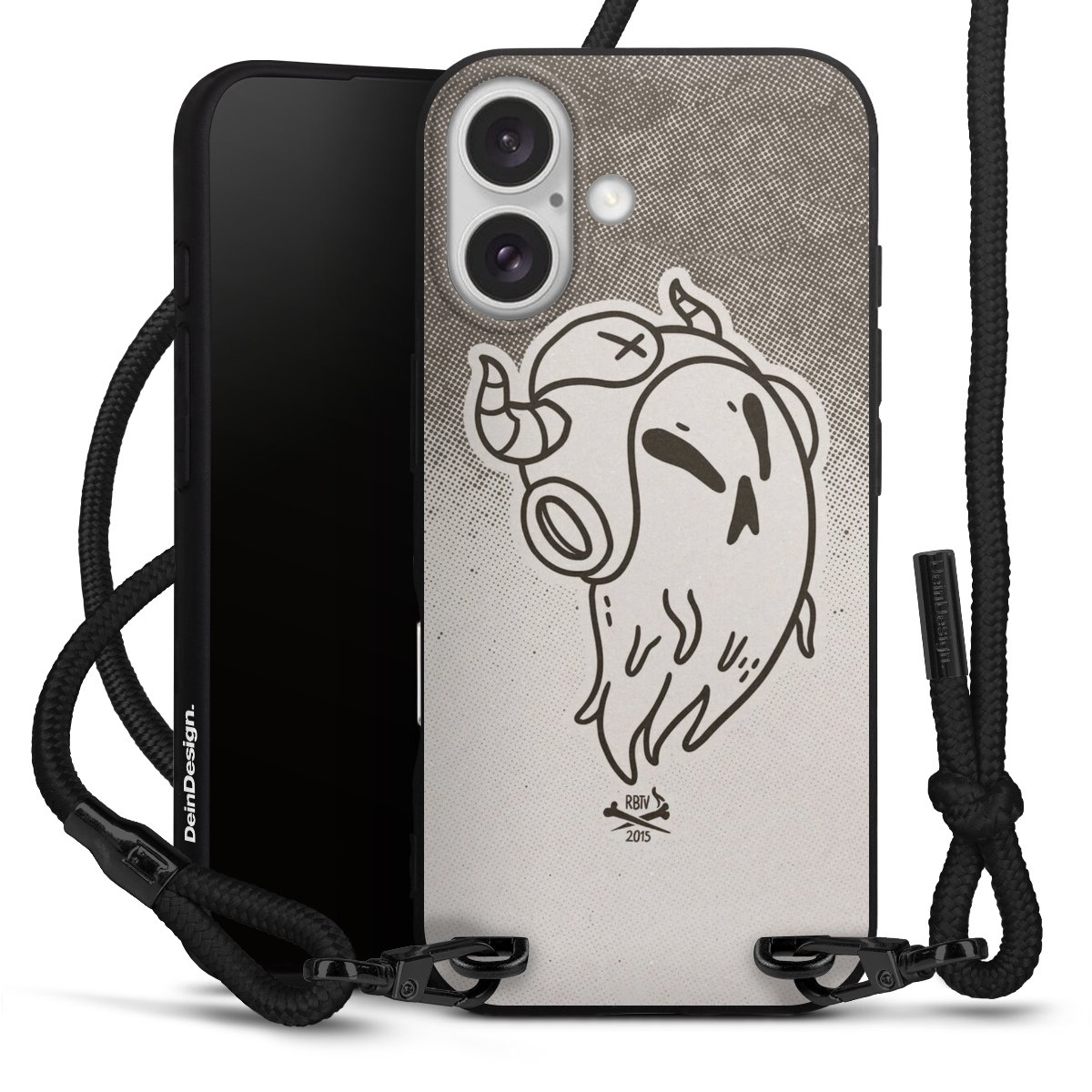 Pure Black: Handyhülle, Stoffband und Metalldetails in stylischem Mattschwarz.