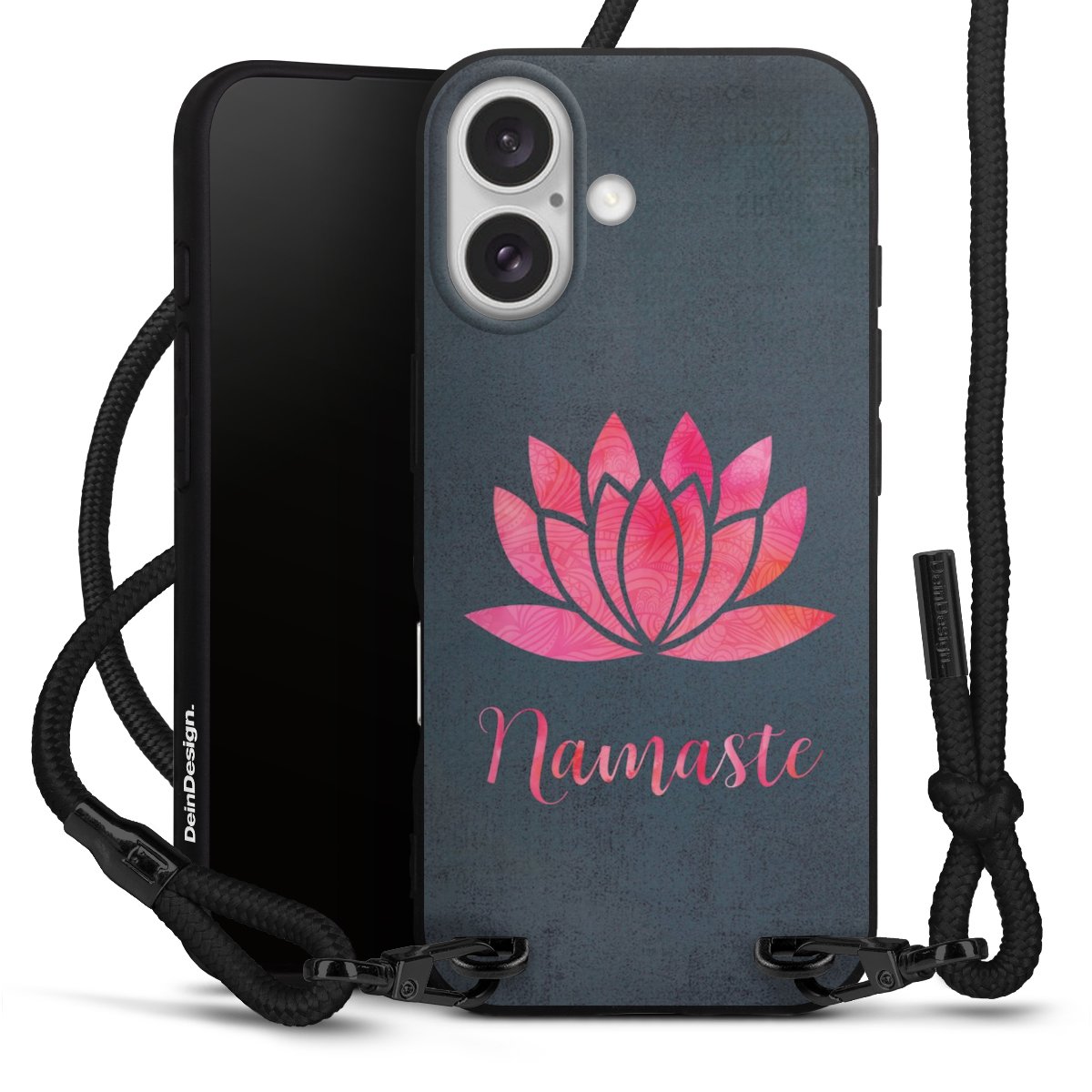 Pure Black: Handyhülle, Stoffband und Metalldetails in stylischem Mattschwarz.
