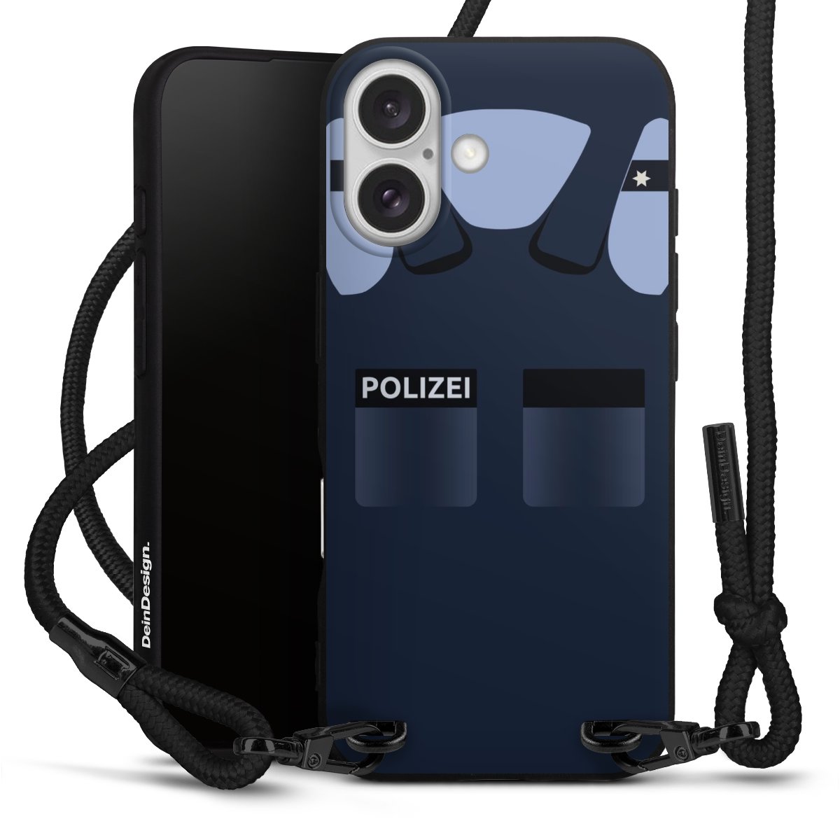 Pure Black: Handyhülle, Stoffband und Metalldetails in stylischem Mattschwarz.