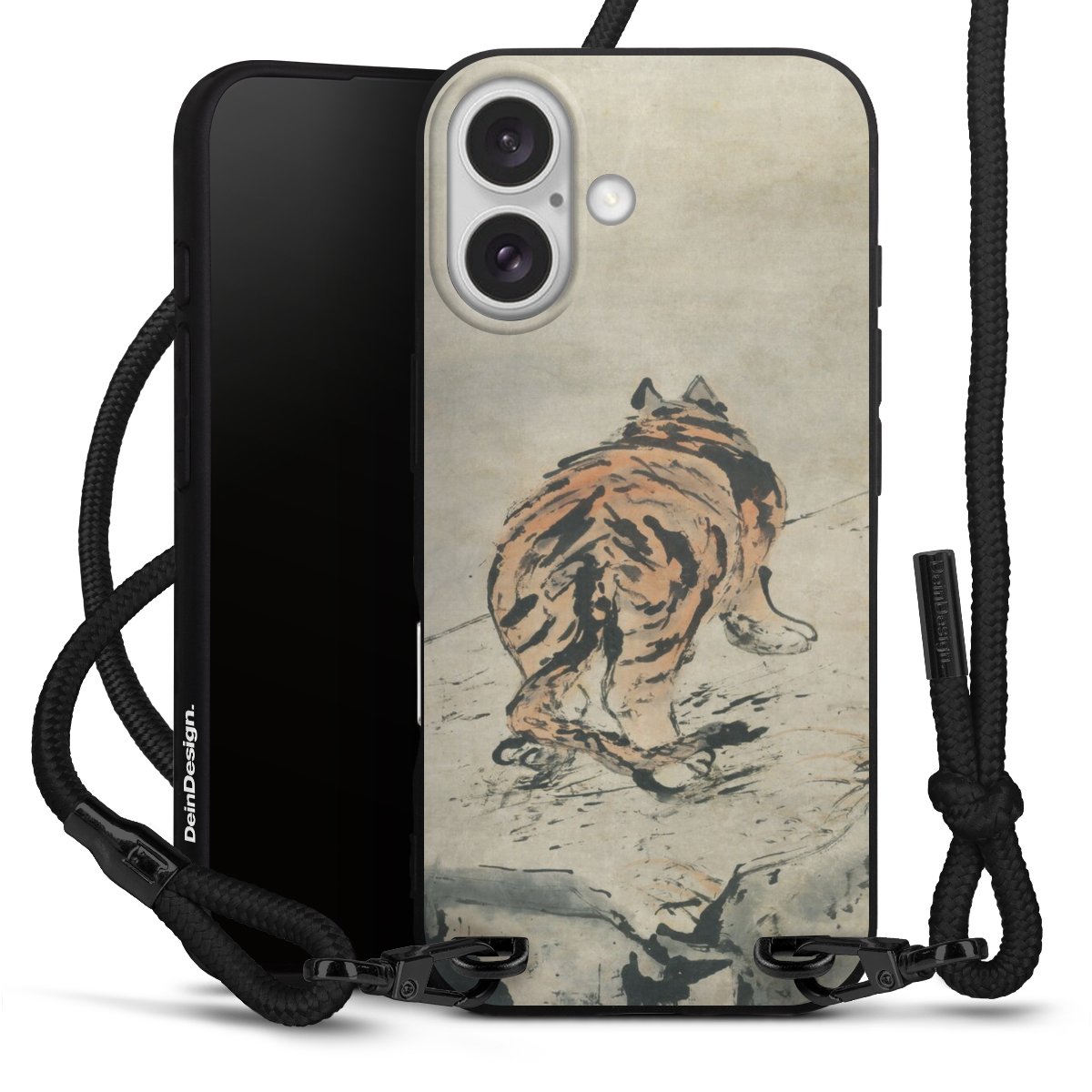Pure Black: Handyhülle, Stoffband und Metalldetails in stylischem Mattschwarz.