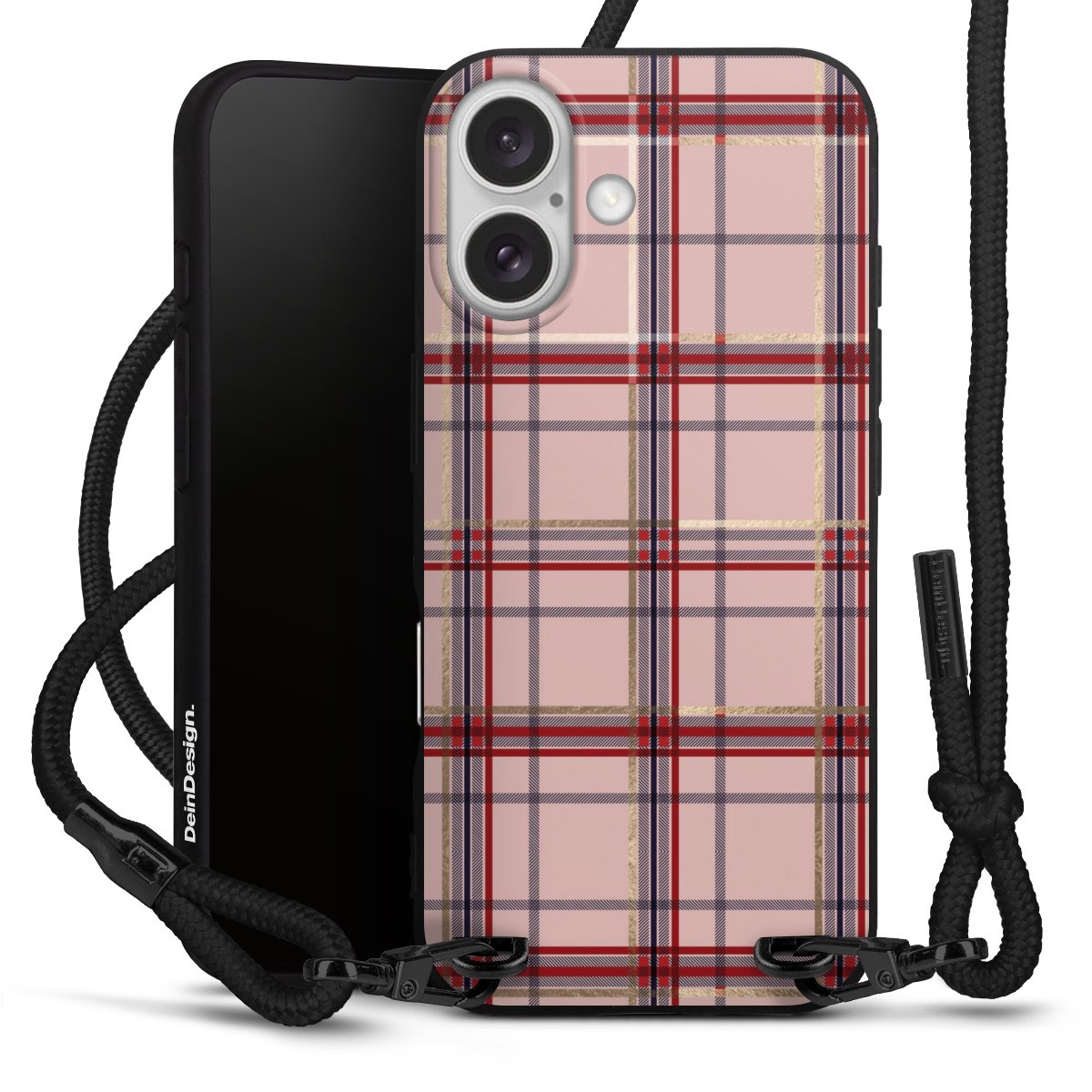 Pure Black: Handyhülle, Stoffband und Metalldetails in stylischem Mattschwarz.