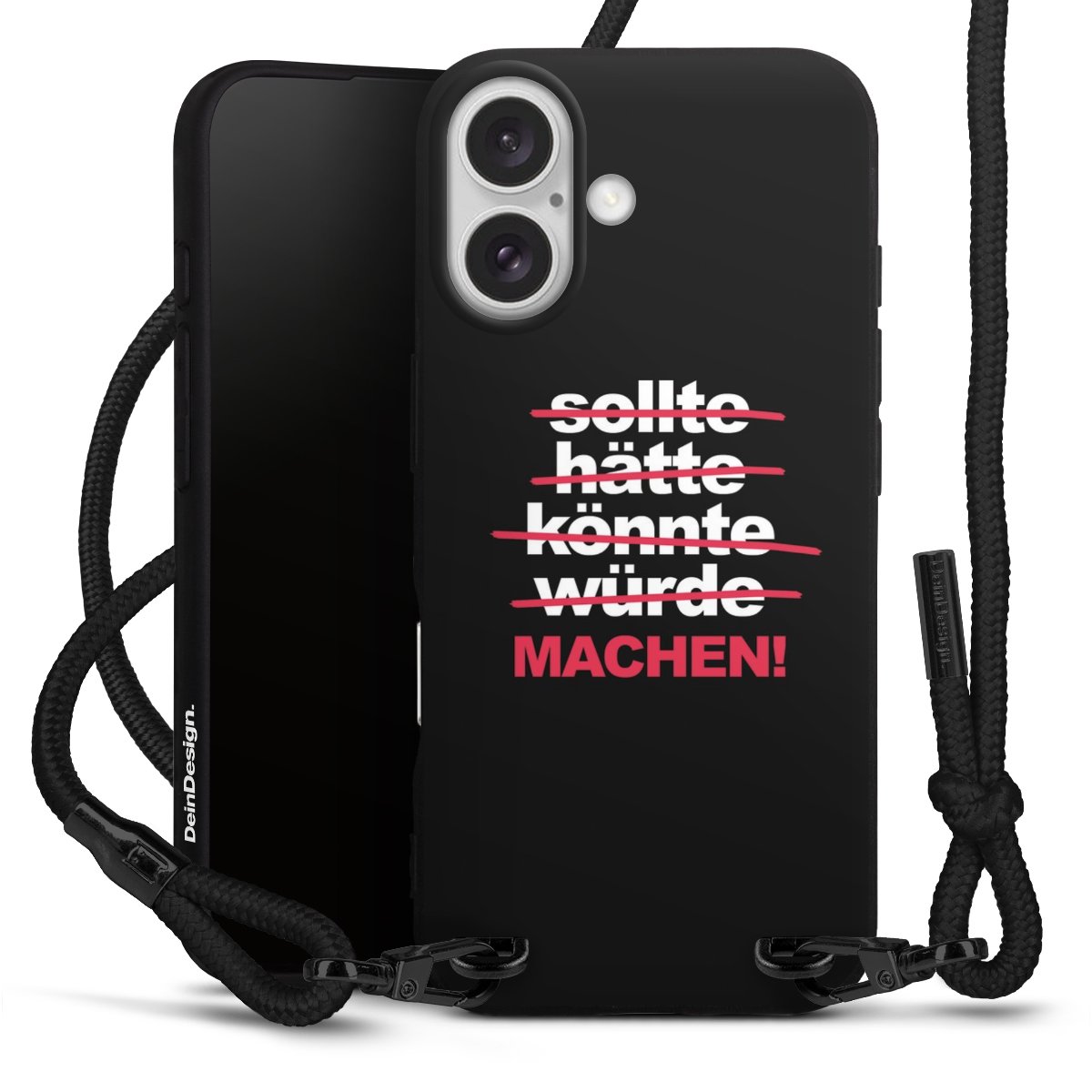 Pure Black: Handyhülle, Stoffband und Metalldetails in stylischem Mattschwarz.