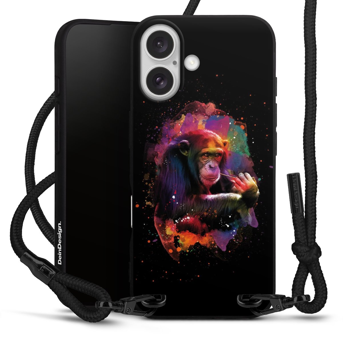 Pure Black: Handyhülle, Stoffband und Metalldetails in stylischem Mattschwarz.