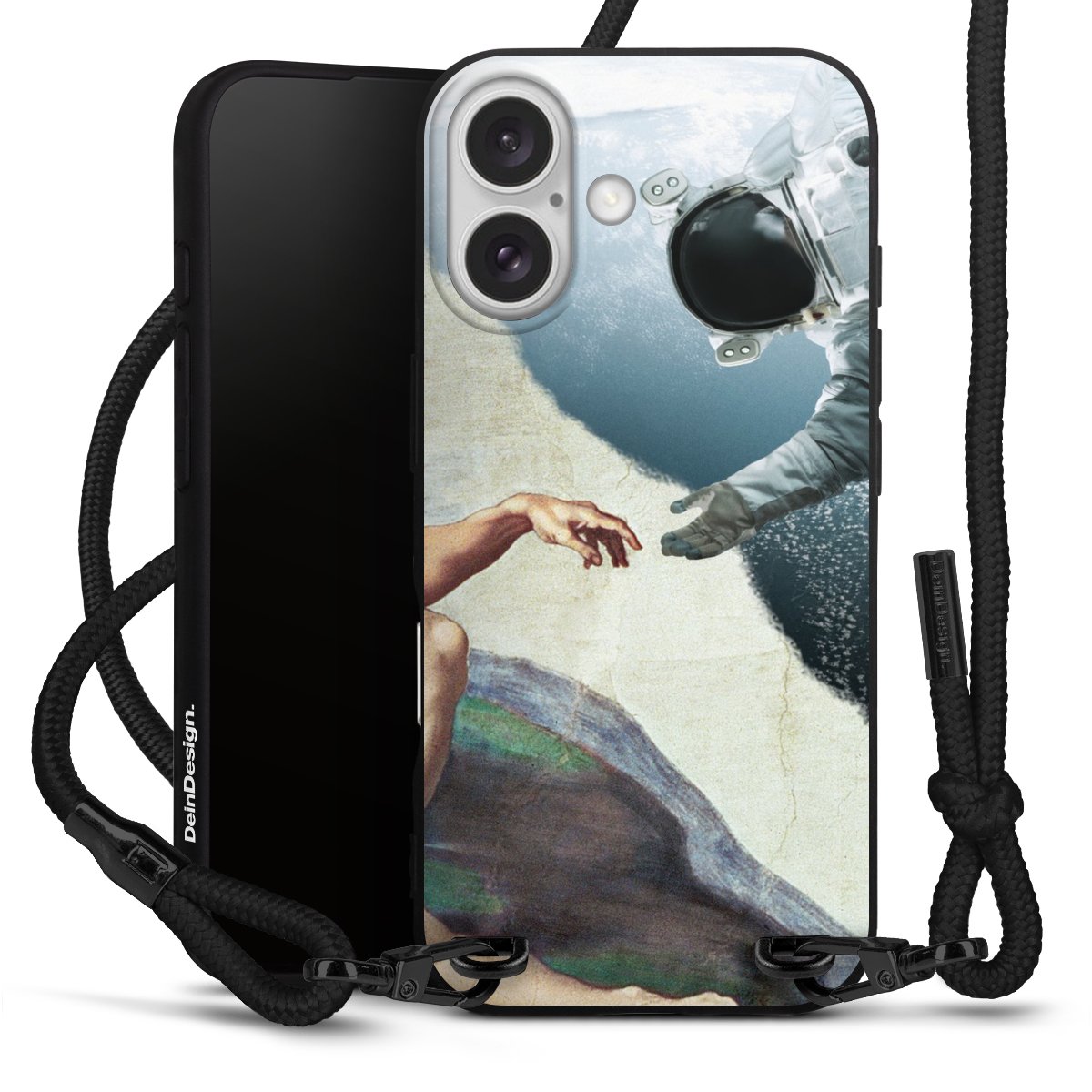 Pure Black: Handyhülle, Stoffband und Metalldetails in stylischem Mattschwarz.