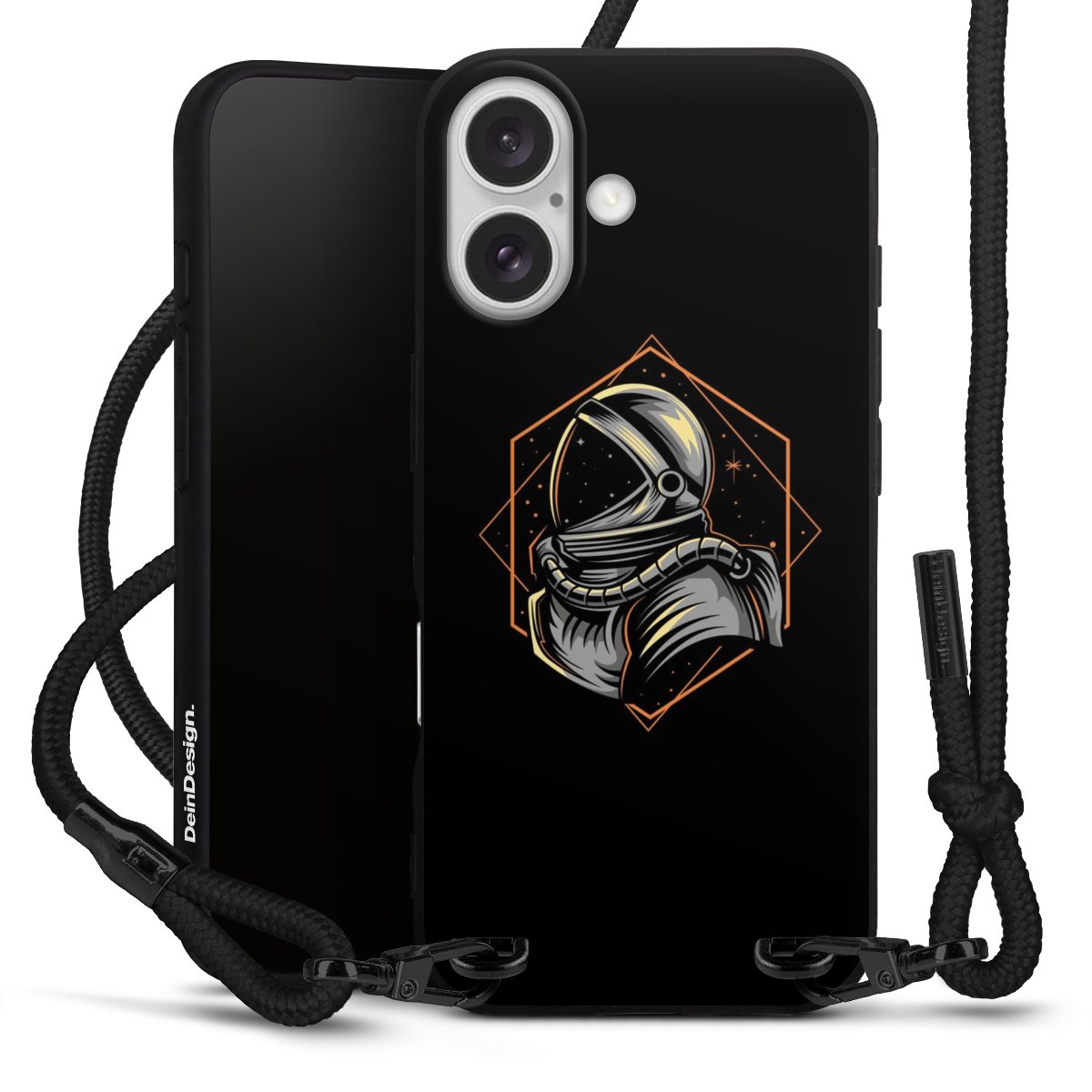 Pure Black: Handyhülle, Stoffband und Metalldetails in stylischem Mattschwarz.