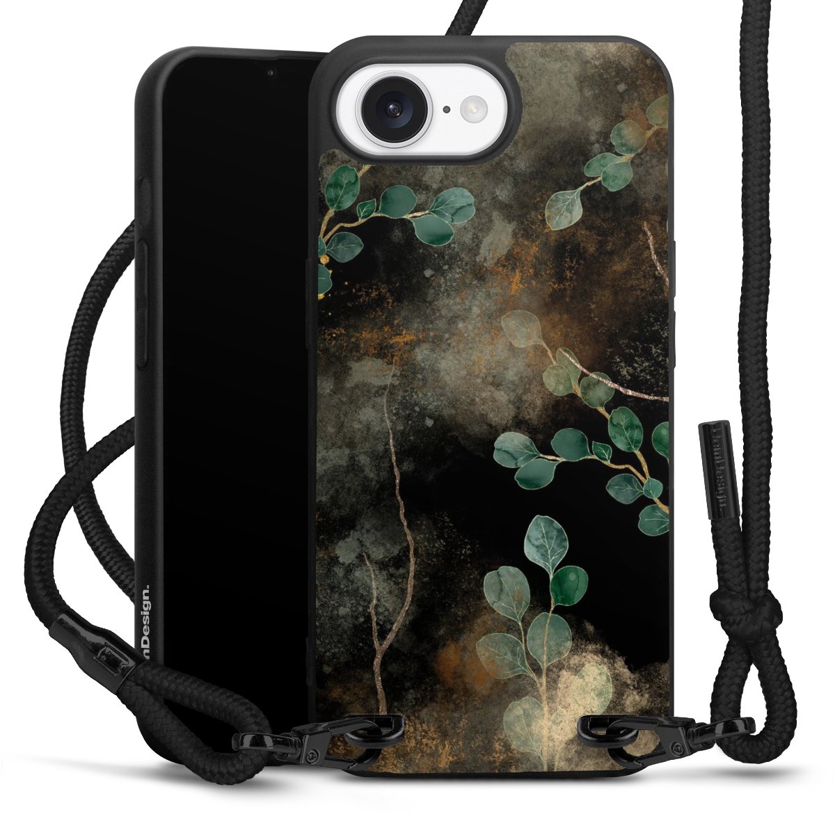 Pure Black: Handyhülle, Stoffband und Metalldetails in stylischem Mattschwarz.