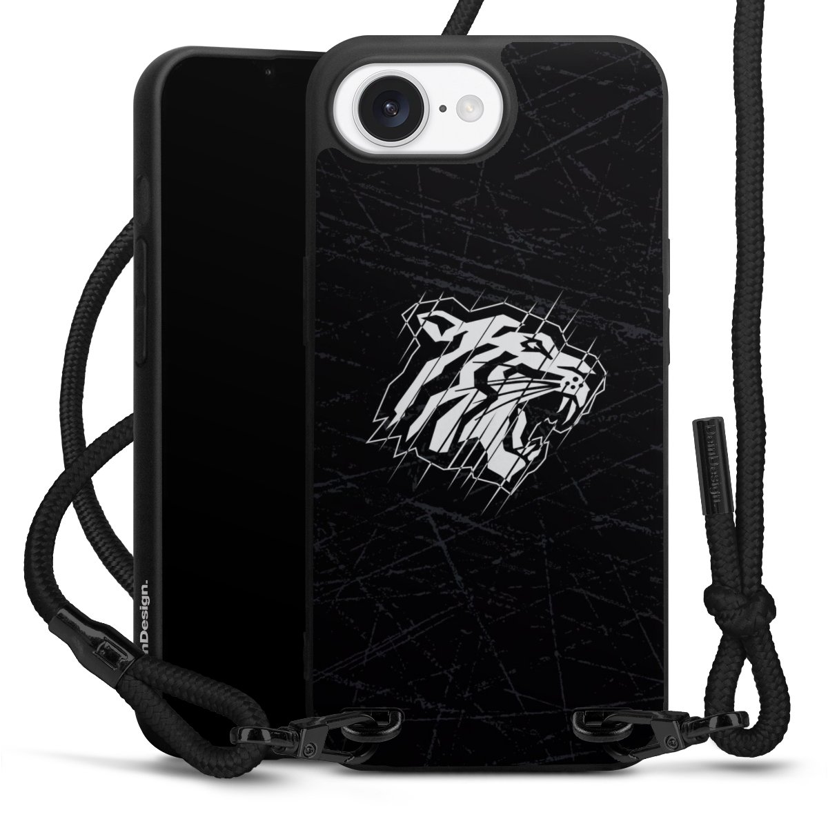 Pure Black: Handyhülle, Stoffband und Metalldetails in stylischem Mattschwarz.