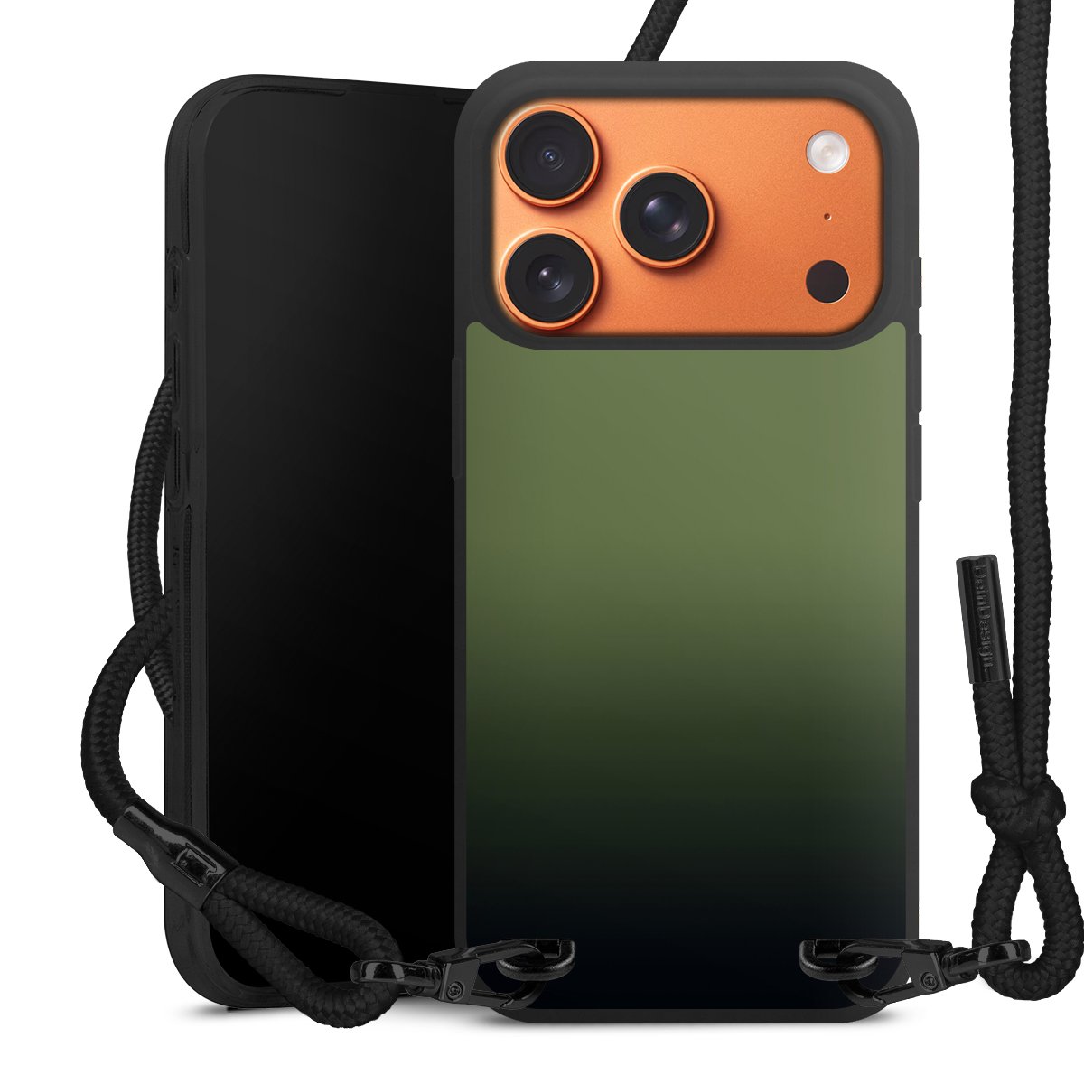 Pure Black: Handyhülle, Stoffband und Metalldetails in stylischem Mattschwarz.